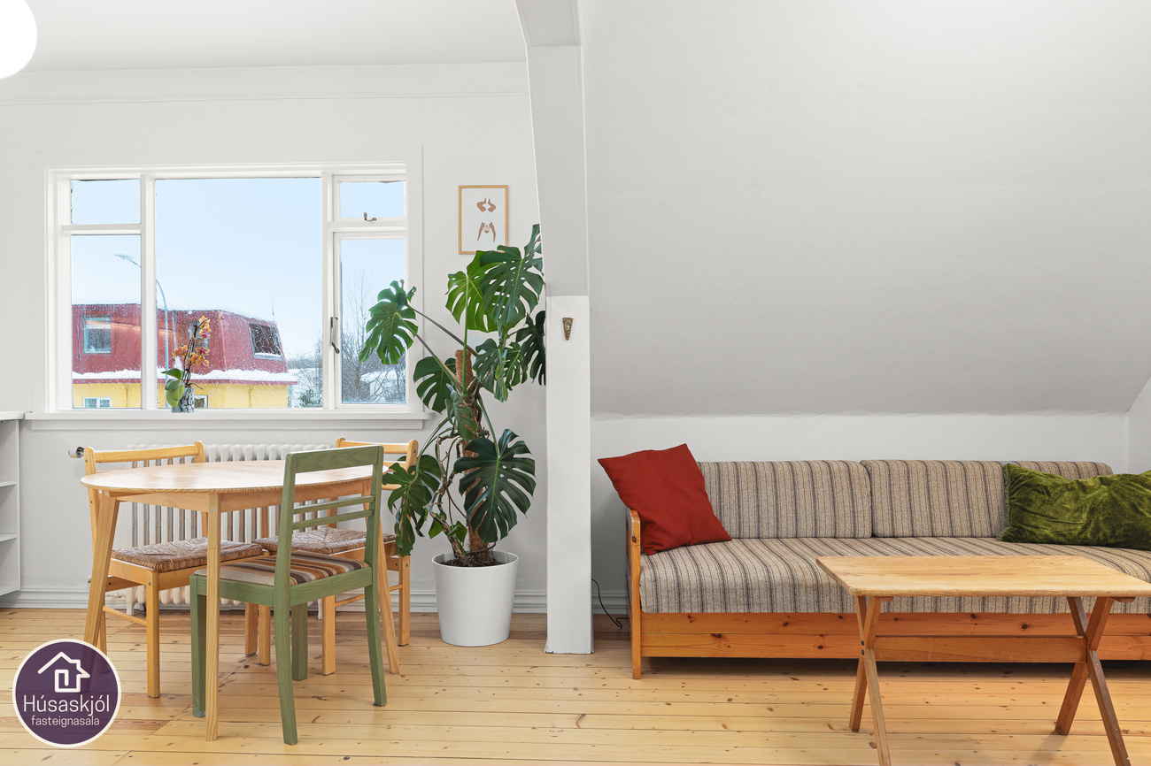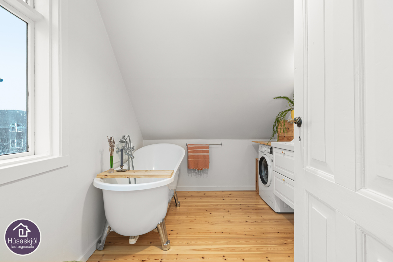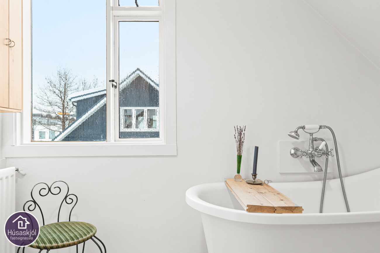 Gengið er inn um sameiginlegan inngang á miðhæð með íbúð neðri hæðar. Dúklagður stigi er upp í risíbúðina. Baðherbergið er rúmgott með sjarmerandi frístandandi baðkari, hvít innrétting með skúffum og innbyggðum vask, upphengt klósett, tengi fyrir þvottavél og opnanlegur gluggi. Eldhús og stofa er eitt opið og bjart alrými með gluggum á tvo vegu. Eldhúsinnréttingin er hvít með efri-og neðri skápum, innbyggður ísskápur, span helluborð með tveimur hellum og hvítur bakaraofn. Svefnherbergin eru tvö og eru þau bæði með góðum gluggum og úr hjónaherberginu er útsýni út á sjó milli húsa. Geymsla er undir stiga á fyrstu hæð hússins.