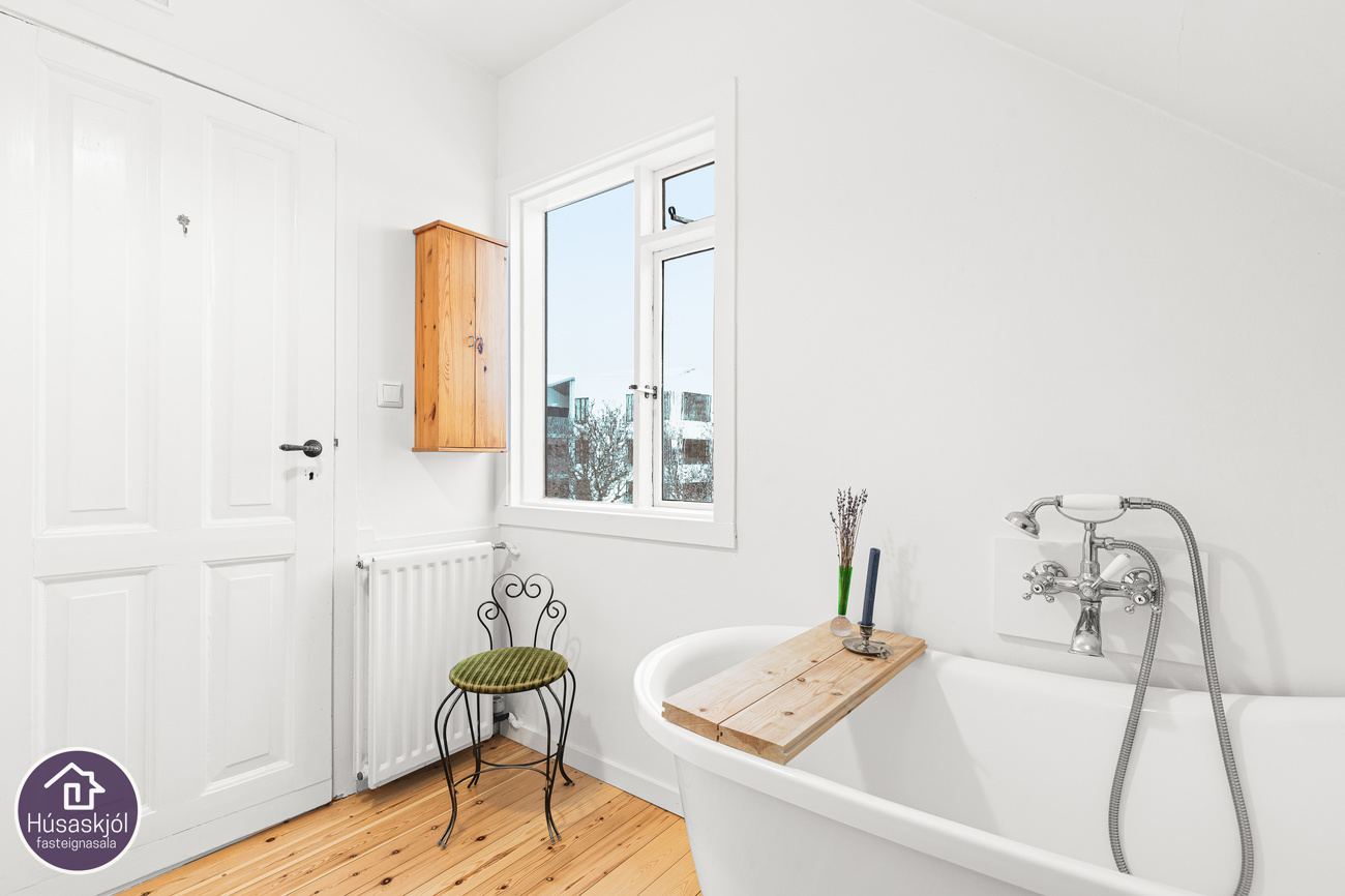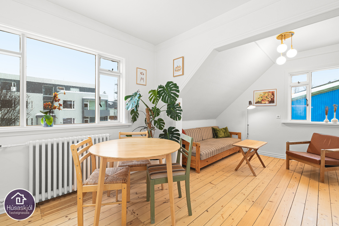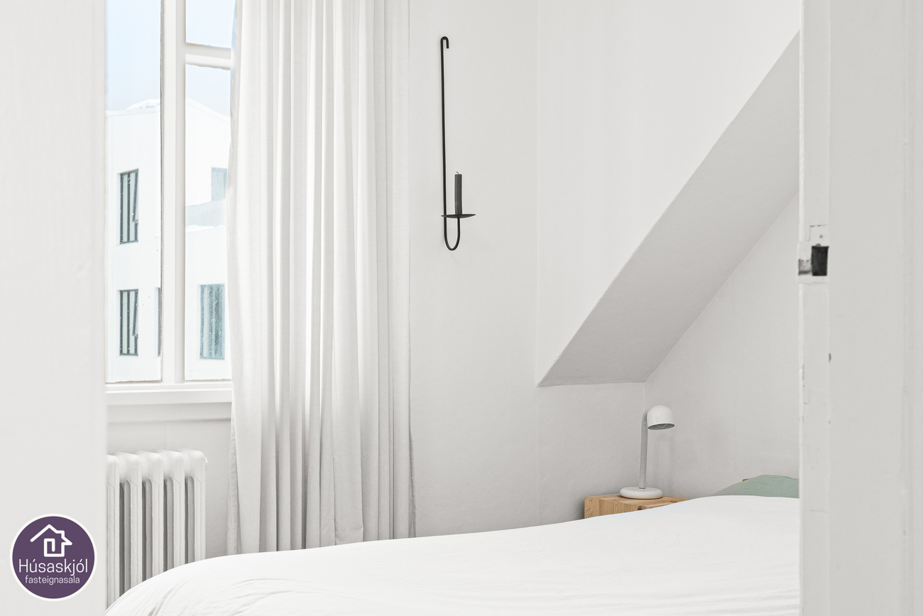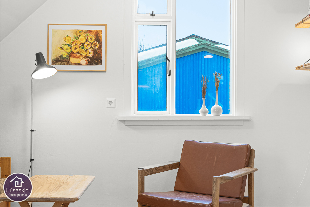 Gengið er inn um sameiginlegan inngang á miðhæð með íbúð neðri hæðar. Dúklagður stigi er upp í risíbúðina. Baðherbergið er rúmgott með sjarmerandi frístandandi baðkari, hvít innrétting með skúffum og innbyggðum vask, upphengt klósett, tengi fyrir þvottavél og opnanlegur gluggi. Eldhús og stofa er eitt opið og bjart alrými með gluggum á tvo vegu. Eldhúsinnréttingin er hvít með efri-og neðri skápum, innbyggður ísskápur, span helluborð með tveimur hellum og hvítur bakaraofn. Svefnherbergin eru tvö og eru þau bæði með góðum gluggum og úr hjónaherberginu er útsýni út á sjó milli húsa. Geymsla er undir stiga á fyrstu hæð hússins.