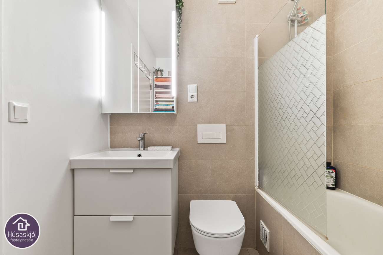 Baðherbergi: Fallegar ljósar flísar á gólfi og hluta af veggjum, hvít innrétting með innbyggðum vask og speglaskápur með lýsingu, upphengt klósett og baðkar með sturtu og gleri.