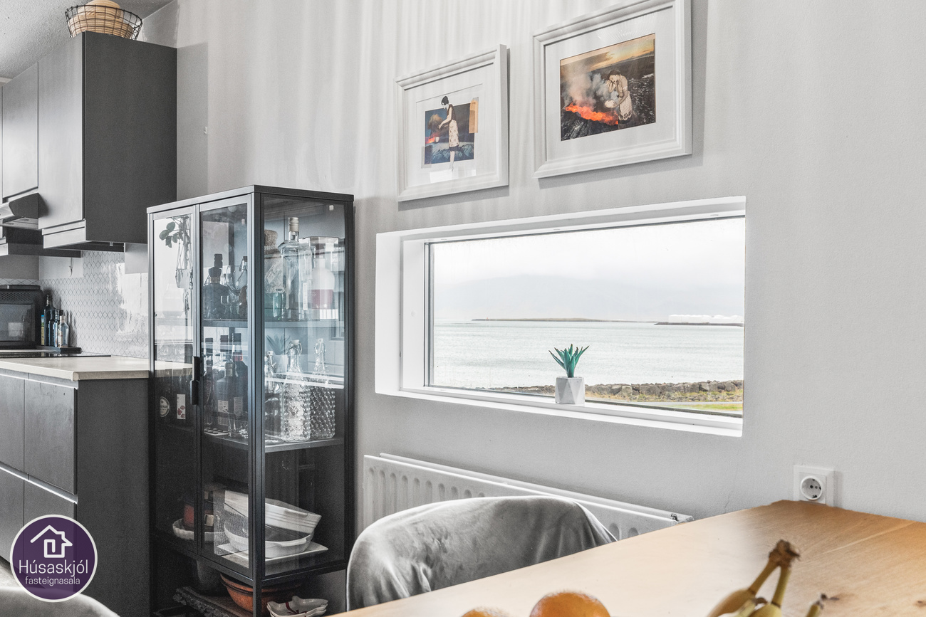Eldhús: Er opið inn í borðstofu og stofu, falleg dökkgrá innrétting með efri-og neðri skápum, endurnýjuðum ofn, keramikhelluborði og viftu. Fallegt útsýni út á sjó.