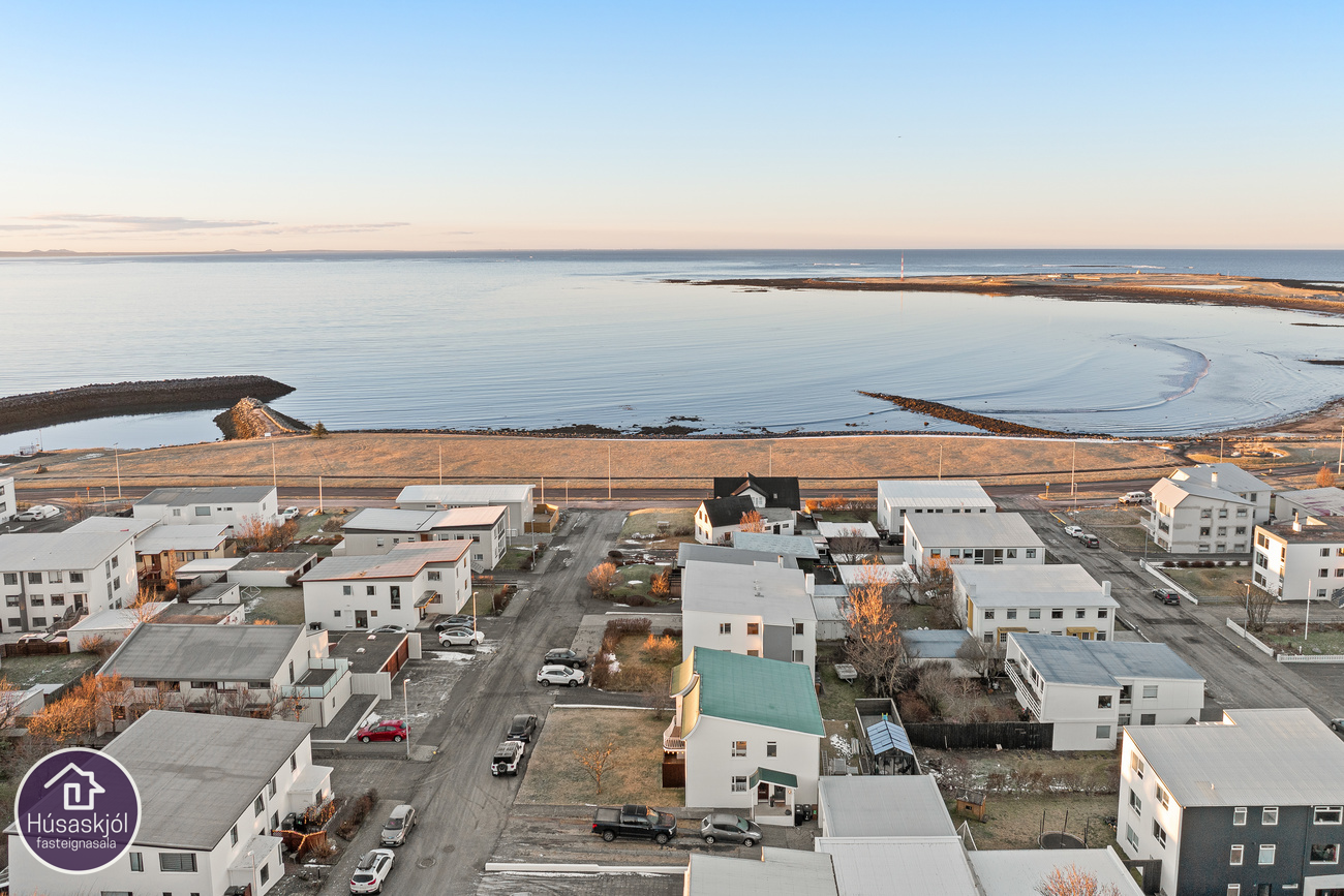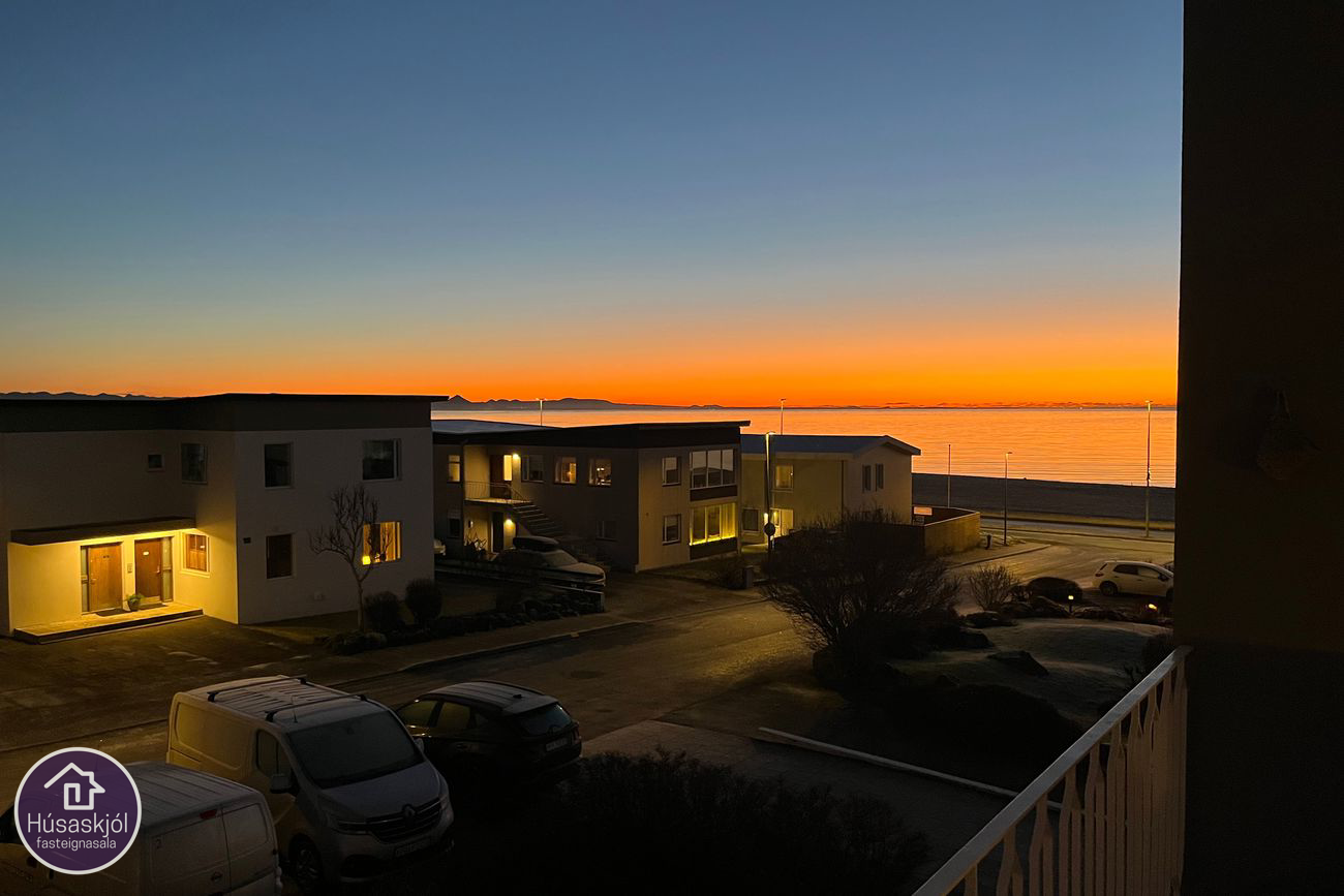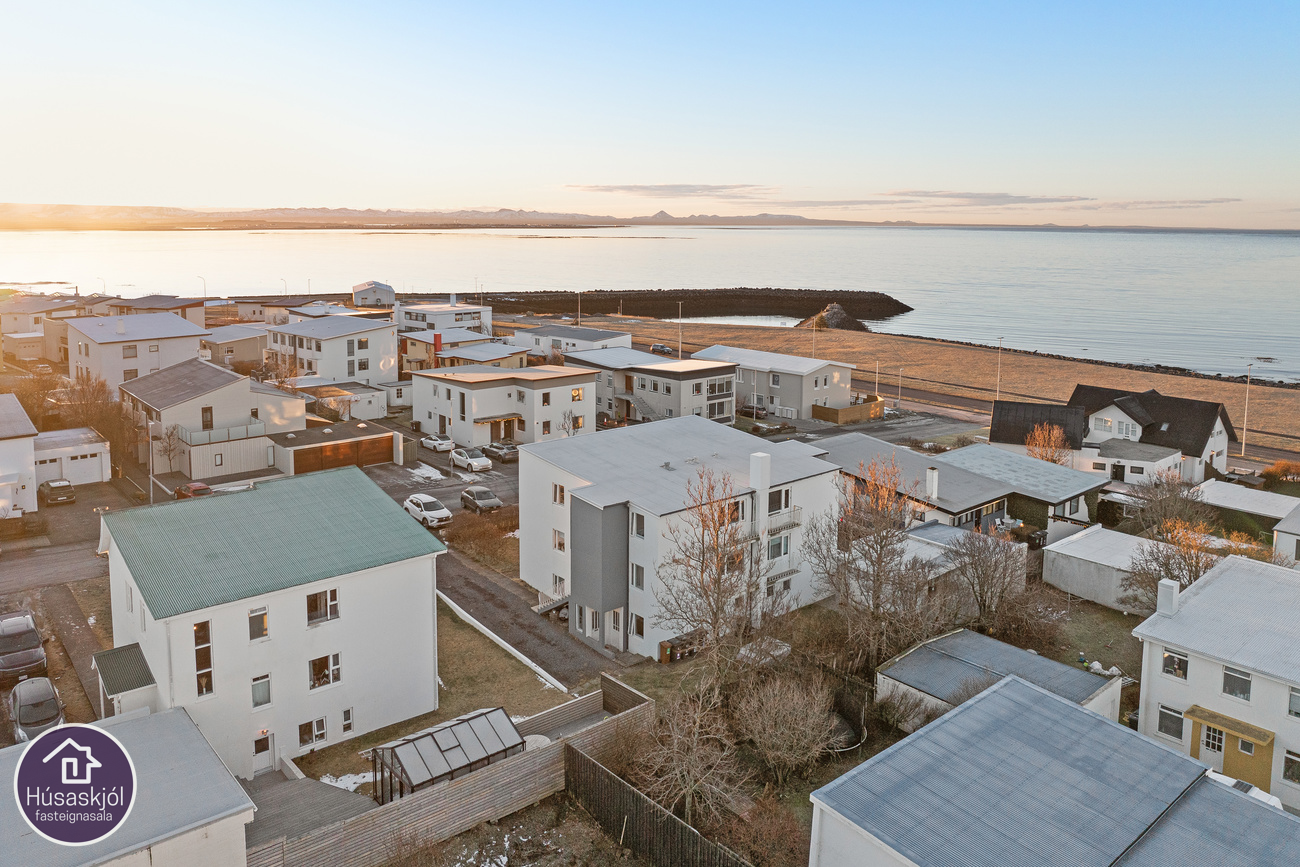 Forstofa er flísalögð með terrazzo flísum, gengið er upp steyptan teppalagðan stiga og komið upp á rúmgóðan stigapall sem er notað sem skrifstofurými og er með góðum fata/geymsluskápum. Möguleiki er að stúka þar af þriðja herbergið. Stofa-,borðstofa og eldhús eru eitt opið og bjart alrými með stórum gluggum og fallegu sjávarútsýni og mikilli lofthæð, harðparket á gólfi. Eldhúsinnréttingin er mjög vönduð, sprautuð dökkblá og er frá þýska framleiðandanum Hacker, kvartsteinn á borðum, eldhústækin eru frá Miele, span-helluborð, ofn, innbyggð uppþvottavél og innbyggður ísskápur frá Liebherr. Rúmgott rými fyrir eldhúsborð og stóla og þaðan er gengið út á suðursvalir sem eru flísalagðar. Baðherbergið er flísalagt með 60x60 cm terrazzo flísum á gólfi og veggjum að hluta, rúmgóður sturtuklefi með gleri, eikarinnrétting með skúffum, borðplata með brúnum kvartsteini og vask úr náttúrusteini. Svefnherbergin eru tvö, bæði með fataskápum og út frá hjónaherberginu eru svalir þar sem njóta má kvöldsólar. Í sameign er sér geymsla og sameiginlegt þvottahús. Garðurinn er gróinn.