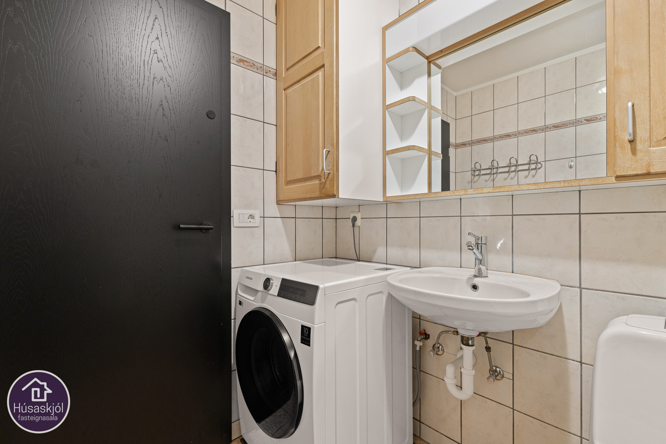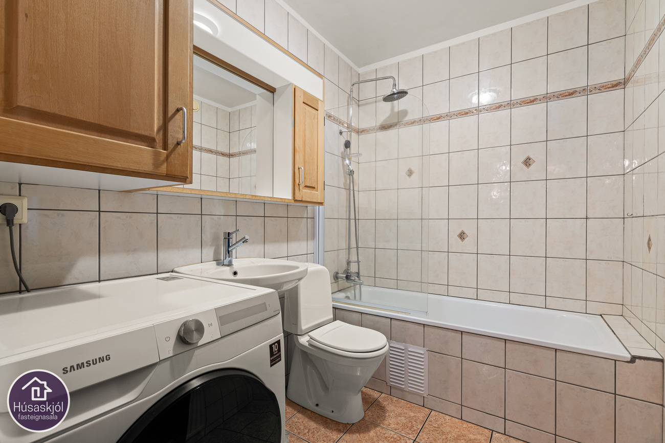 Baðherbergi er flísalagt í hólf og gólf, baðkar með sturtuaðstöðu, pláss fyrir þvottavél.