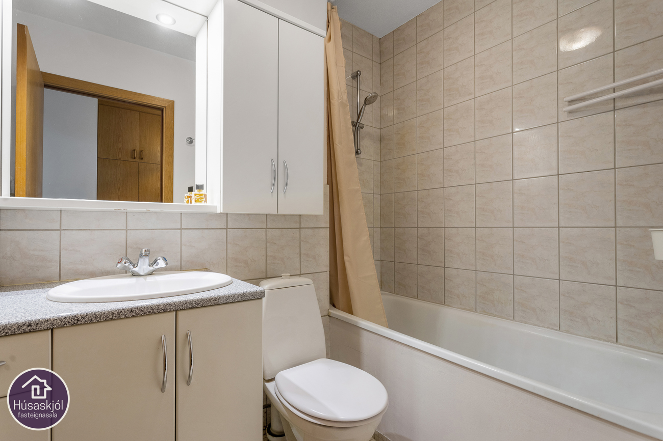 Baðherbergið er flísalagt, baðkar með sturtuaðstöðu.