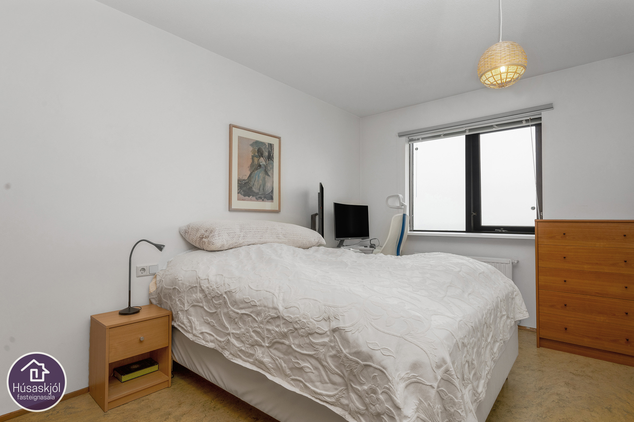 Svefnherbergið er rúmgott með góðum fataskápum.