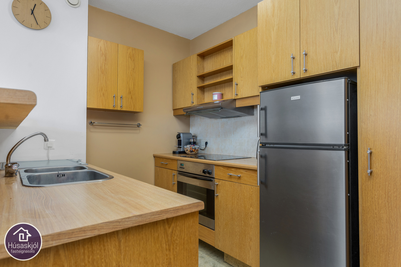 Eldhúsið er með góðri innréttingu og er opið inn í stofu. Ísskápur og uppþvottavél fylgja. (uppþvottavélin fellur ofan í borð)