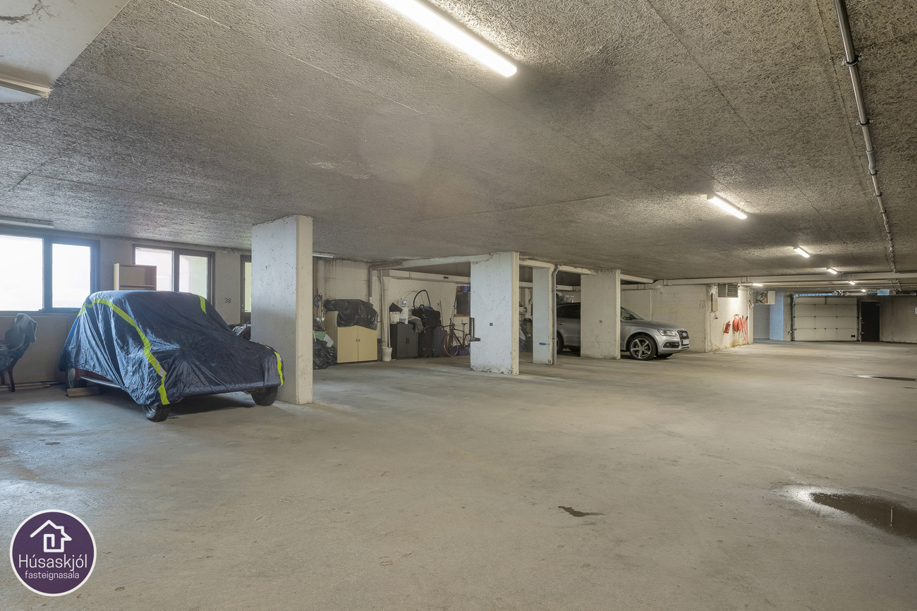 Sér merkt stæði í bílgeymslu við Austurströnd 2-4.