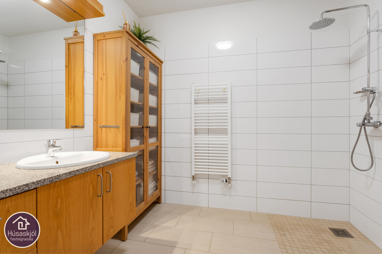 Baðherbergið er flísalagt í hólf og gólf, vaskur í lítilli innréttingu með granít boðrplötu, sturta og upphengt wc, gólfhiti.