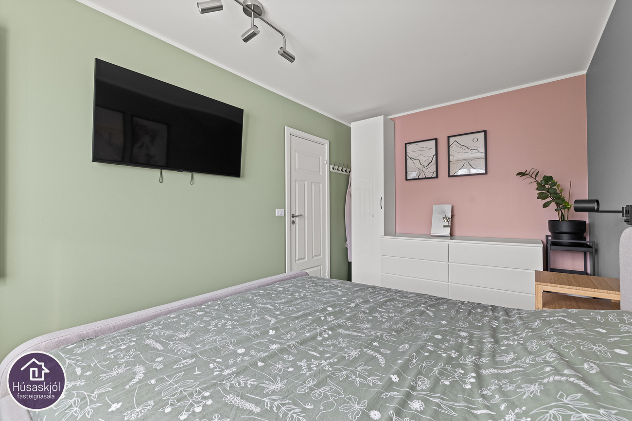Hjónaherbergi er rúmgott með parket á gólfi.