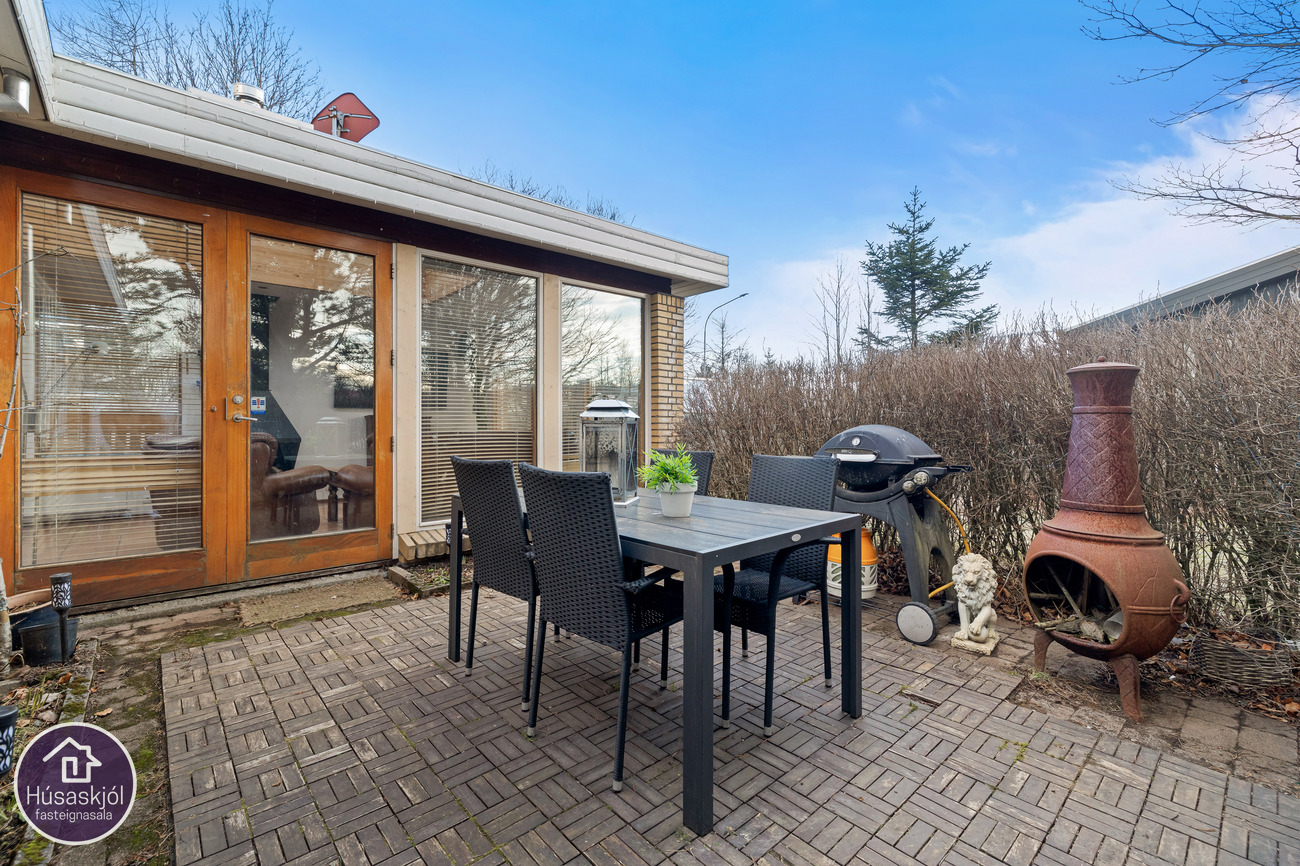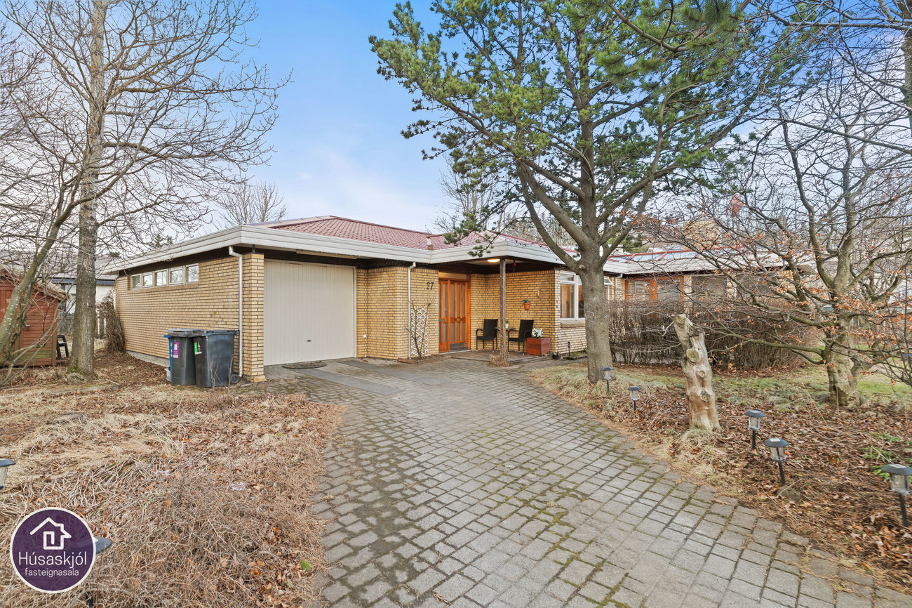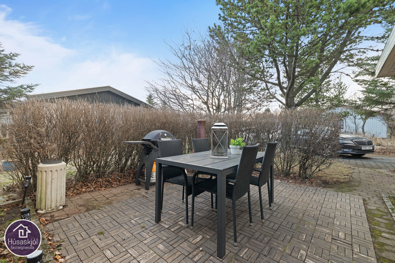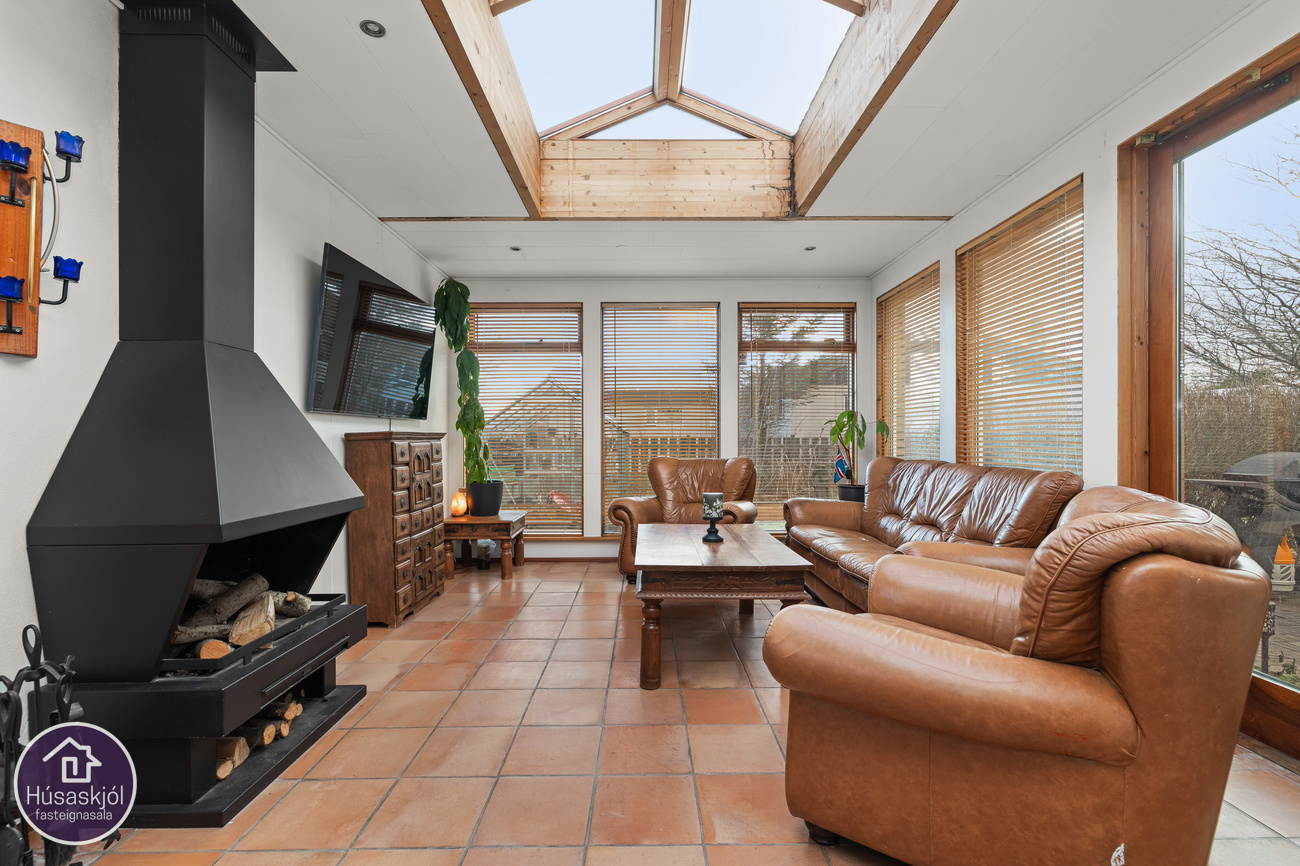 Lýsing eignar: Komið er inn í forstofu með flísum á gólfi og fatahengi. Gestasalerni með flísum á gólfi. Rúmgott eldhús með U-laga innréttingu, efri og neðri skápum, gluggar og borðkrókur, korkur á gólfi. Við hlið eldhúss er borðstofa og sjónvarpshol og þaðan er gengið inn í stóran garðskála með arni, flísalögðu gólfi og stórum þakglugga. Frá garðskála er gengið út á pall og þaðan út í garð með gróðurhúsi. 4 svefnherbergi, öll með parketi og 3 með skápum. Baðherbergi er flísalagt í hólf og gólf með bæði baðkari og sturtu, gluggi á baðherbergi. Þvottahús er með tengi fyrir þvottavél og þurrkara og þaðan er innangengt í bílskúrinn. Hann er með máluðu gólfi, heitu og köldu vatni, rafmagni og góðum gluggum. Búið að stúka af geymslu í enda bílskúrs.