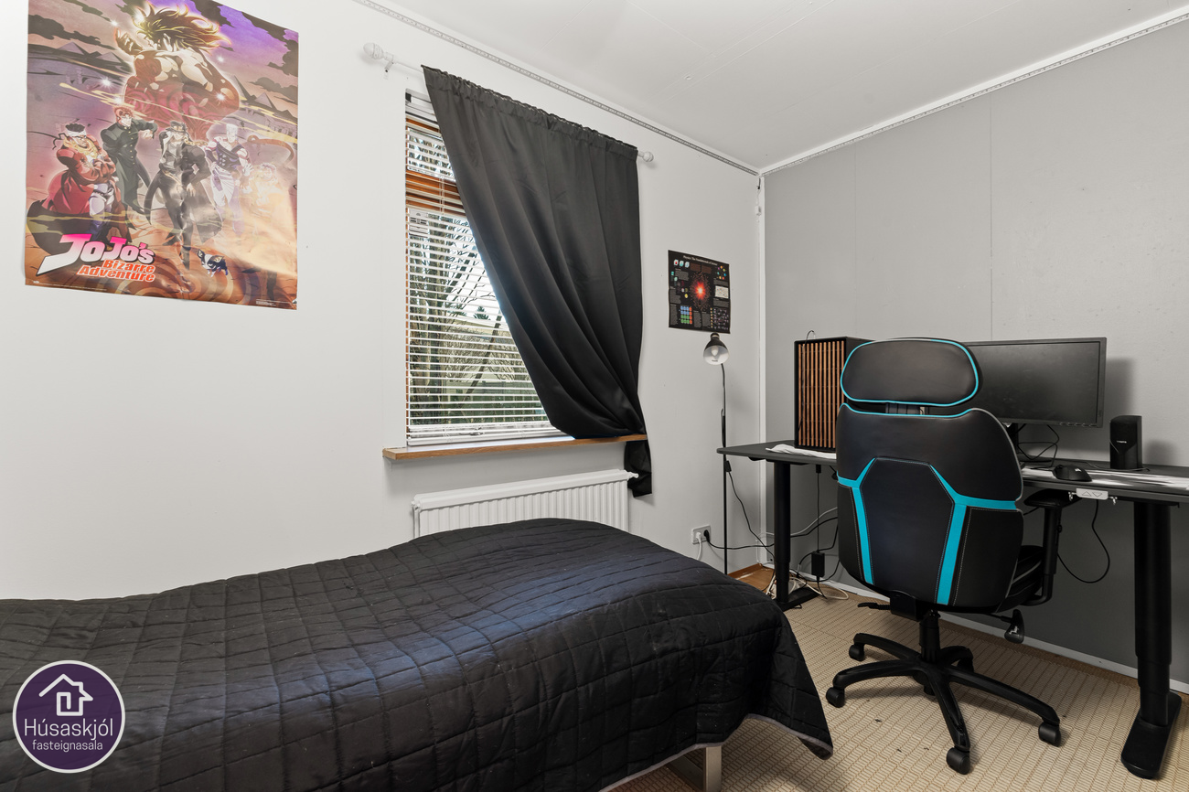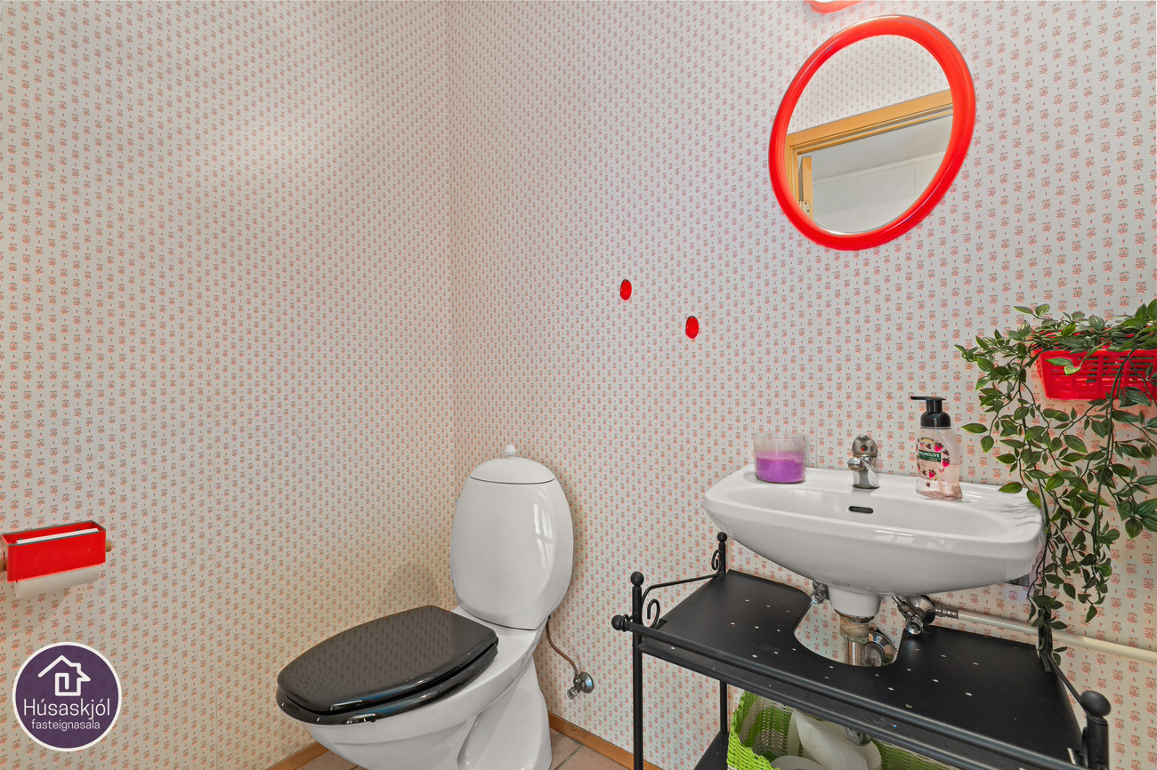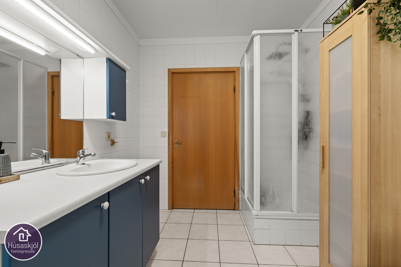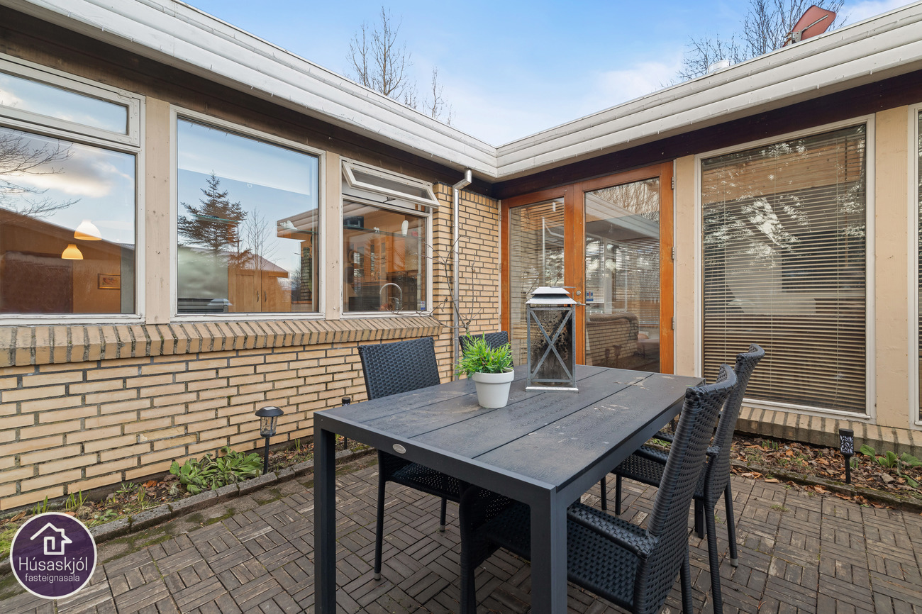 Lýsing eignar: Komið er inn í forstofu með flísum á gólfi og fatahengi. Gestasalerni með flísum á gólfi. Rúmgott eldhús með U-laga innréttingu, efri og neðri skápum, gluggar og borðkrókur, korkur á gólfi. Við hlið eldhúss er borðstofa og sjónvarpshol og þaðan er gengið inn í stóran garðskála með arni, flísalögðu gólfi og stórum þakglugga. Frá garðskála er gengið út á pall og þaðan út í garð með gróðurhúsi. 4 svefnherbergi, öll með parketi og 3 með skápum. Baðherbergi er flísalagt í hólf og gólf með bæði baðkari og sturtu, gluggi á baðherbergi. Þvottahús er með tengi fyrir þvottavél og þurrkara og þaðan er innangengt í bílskúrinn. Hann er með máluðu gólfi, heitu og köldu vatni, rafmagni og góðum gluggum. Búið að stúka af geymslu í enda bílskúrs.