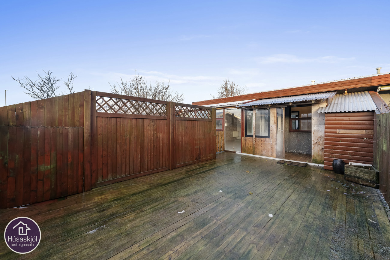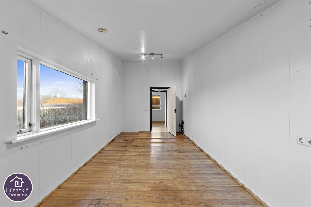 Íbúðin skiptist í forstofu, 4 svefnherbergi, baðherbergi, (eldhús) og stofu og þaðan er gengið út á verönd sem snýr í suður. Eignin er ekki upphituð í dag.