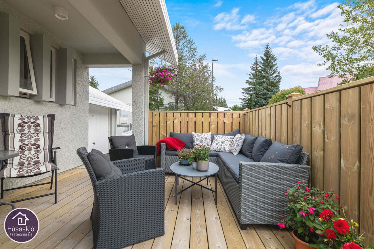 Fyrir framan neðri hæðina er sér sólpallur og gott útisvæði með hita í stéttum.