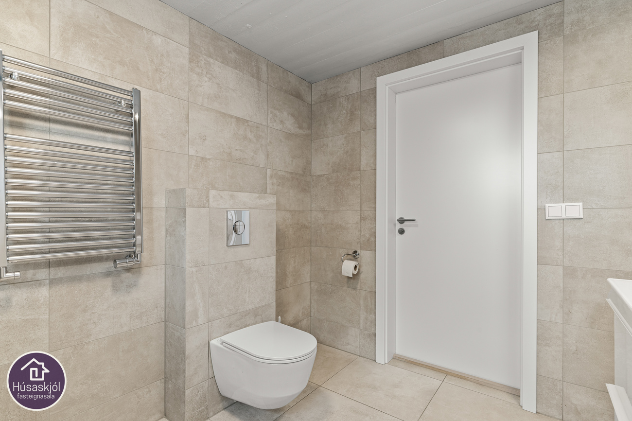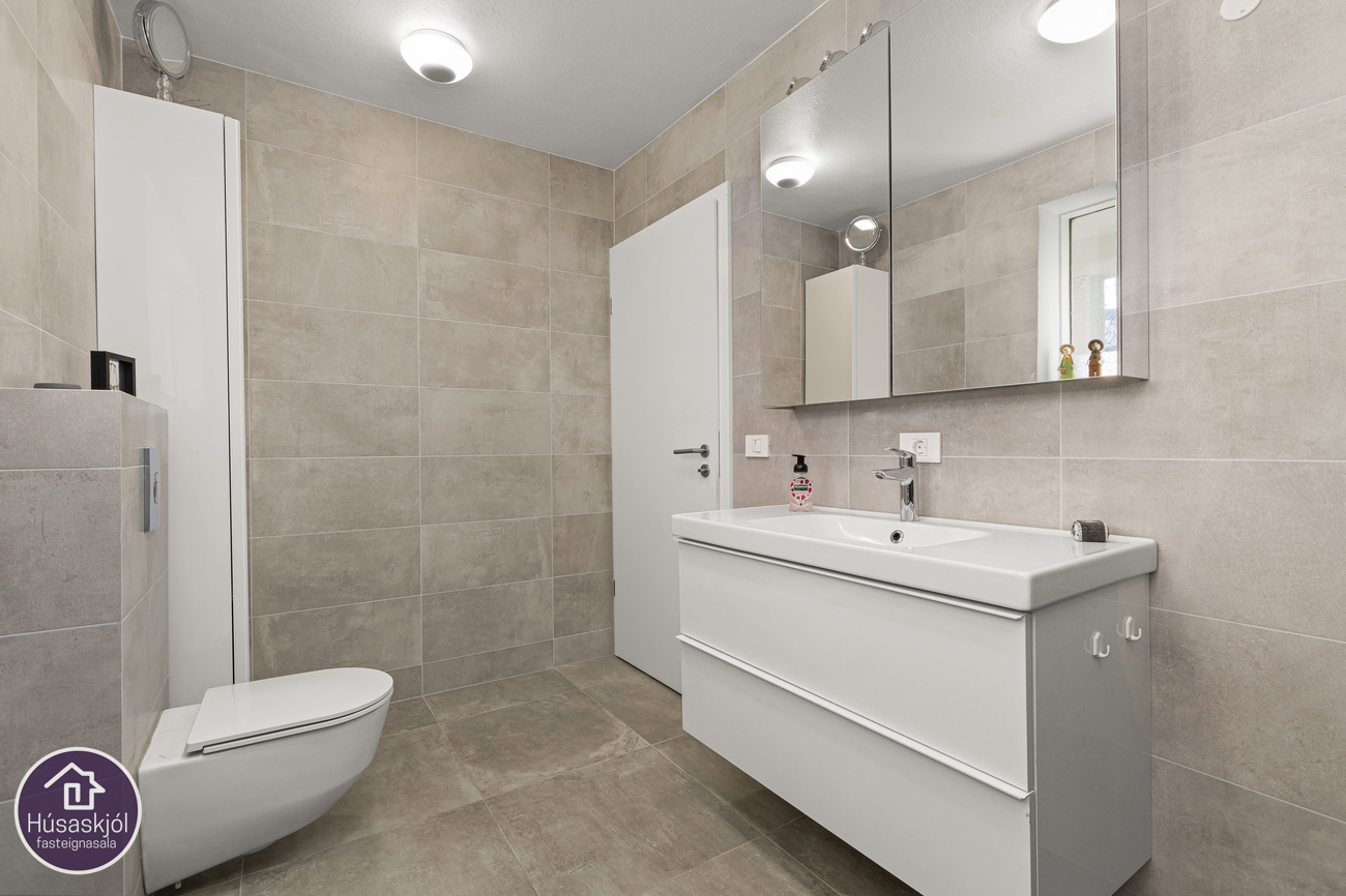 Baðherbergi er mjög rúmgott og flísalagt í hólf og gólf. Walk in sturta með kraftmikilli sturtu. Gluggar og handklæðaofn.