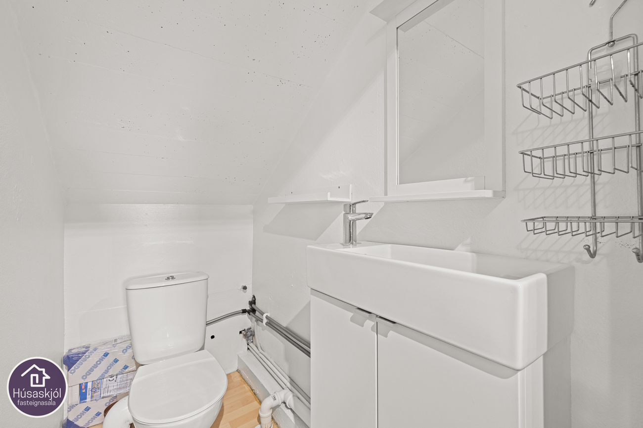 Úr holinu er farið upp á nýuppgert parketlagt rými á háalofti sem liggur yfir húsinu og er óskráð. Rýmið er ca 50 fm (að sögn seljenda) og býður uppá mikla möguleika. Gluggar eru á báðum göflum og auðvelt að skipta rýminu .Einnig er mikið geymslurými undir súðinni.