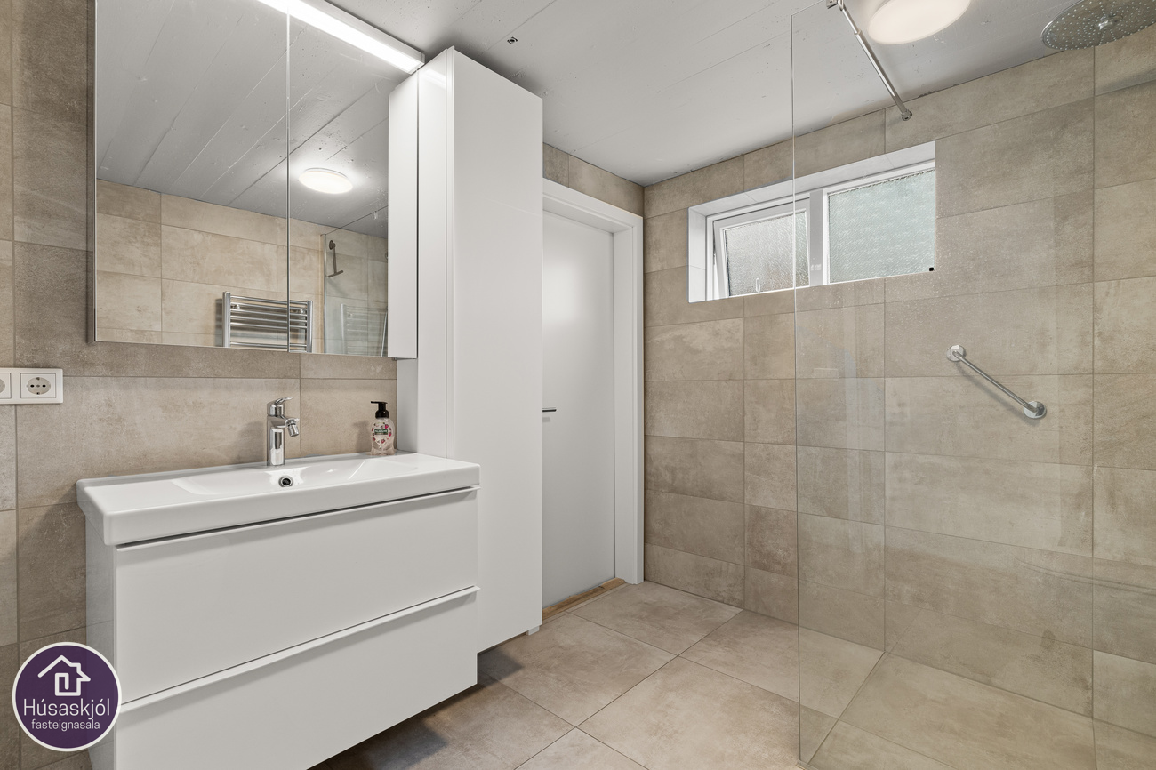 Baðherbergi er flísalagt í hólf og gólf. með walk in sturtu og glugga. Innaf baðherbergi er þvottahús/geymsla.