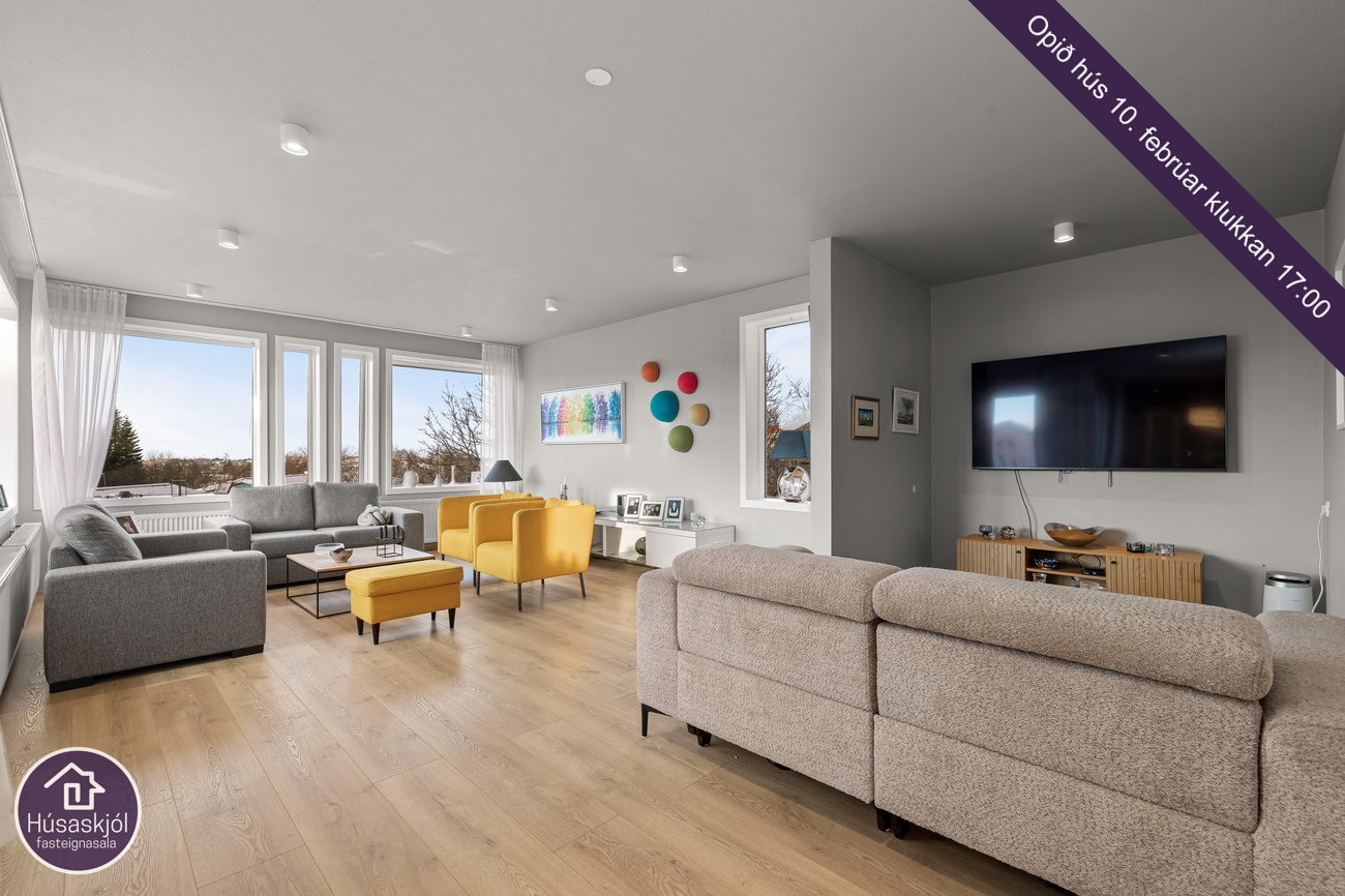 Bjartar rúmgóðar stofur með útsýni. Gengið út á svalir úr stofunni og þar er stigi niður í garðinn.