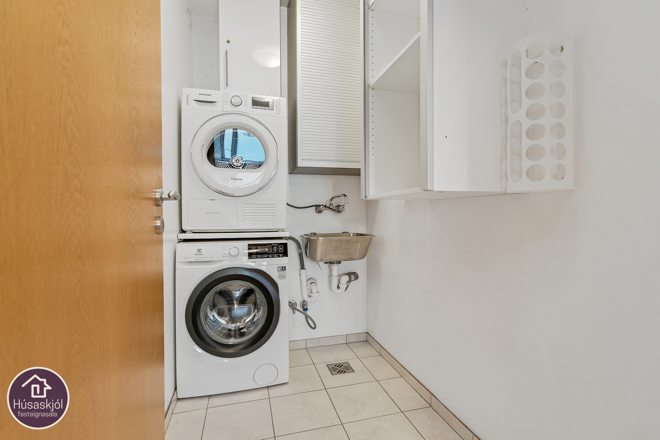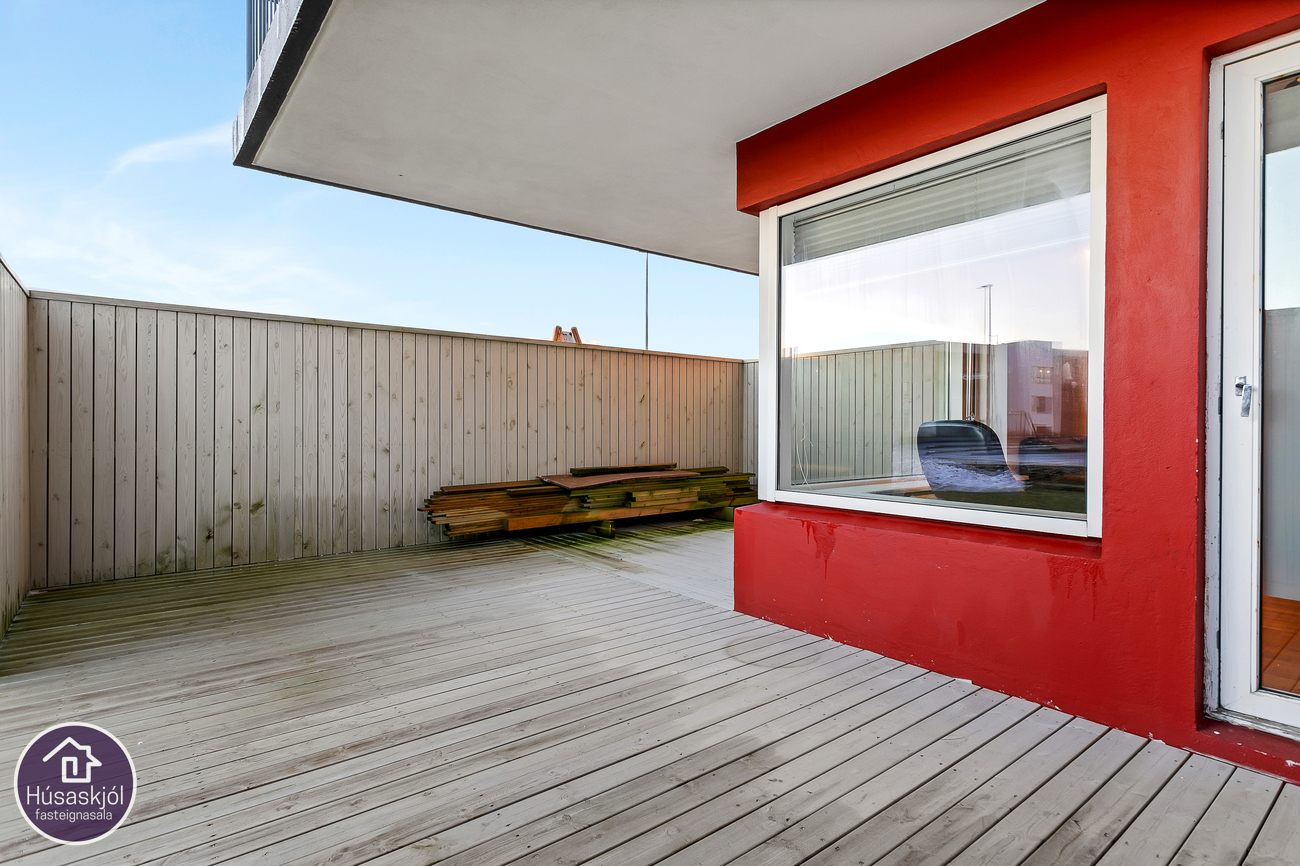Lýsing eignar: Komið er inn í forstofu með parketi og 2 föstum skápum. 2 svefnherbergi bæði rúmgóð með parketi og skápum. Eldhús og stofa er opið rými. L-laga eldhúsinnrétting með efri og neðri skápum ásamt innréttingu á einum vegg á móti, parket á gólfi. Frá stofu er gengið út á afgirtan sérafnotarétt sem snýr í suður, geymsla á pallinum. Baðherbergi er flísalagt í hólf og gólf með sturtu, handklæðaofni og upphengdu salerni. Þvottahús er innan ibúðar með flísum á gólfi og vaski. Geymsla er innan íbúðar, parket á gólfi.