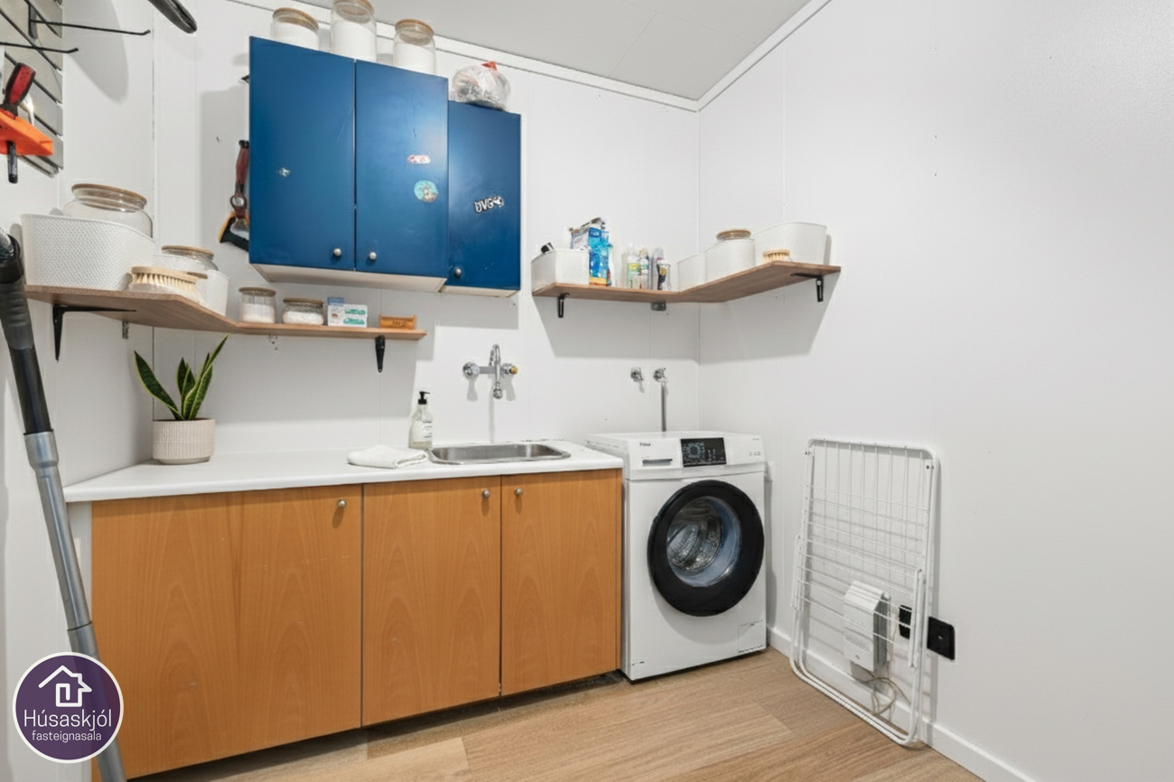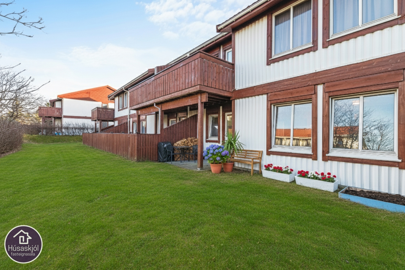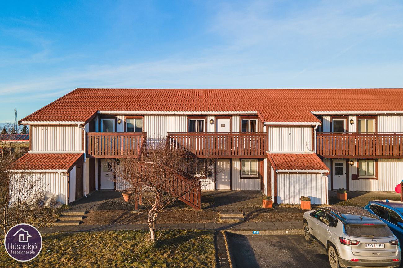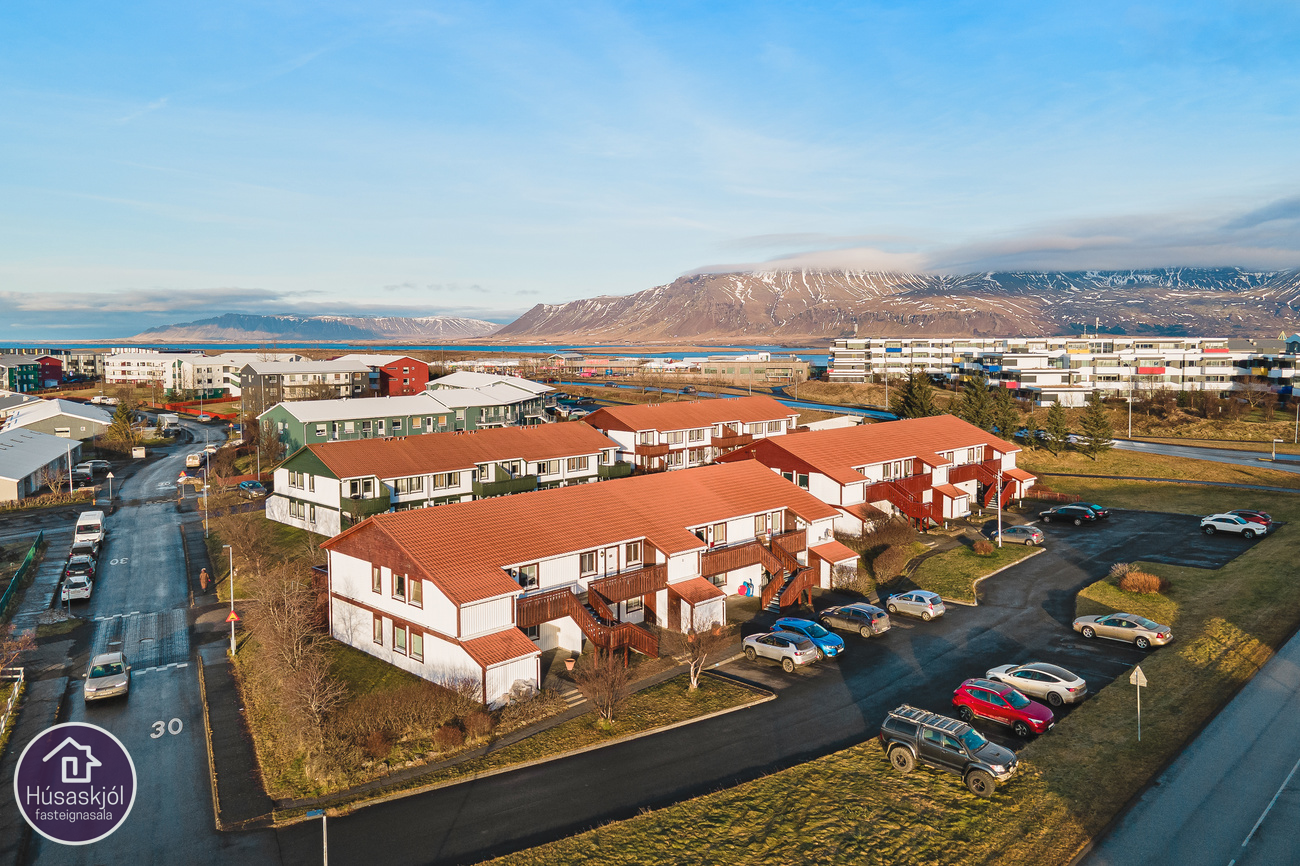 Gengið er inn beint í íbúð frá bílastæði og því mjög þægilega aðkoma. Sérinngangur í íbúðina og komið inn í forstofu með flísum á gólfi og fatahengi. 2 svefnherbergi innan íbúðar, bæði með fataskáp og harðparketi á gólfi. Þvottahús/geymsla er innan íbúðar, dúkur á gólfi og vaskur. Baðherbergi er með náttúrustein á gólfi, sturtuklefa og tengi fyrir handklæðaofni. Eldhús og stofa er opið rými. Eldhúsinnrétting er L-laga með efri og neðri skápum ásamt eyju. Neðri skápar eru upprunalegir en efri skápar og eyjan er endurnýjuð fyrir nokkrum árum, innrétting frá Innlifun ehf, borðplatan frá Fantofell og spanhelluborð. Harðparket á gólfum. Frá eldhúsi er gengið út á óafgirtan sérafnotarétt.
