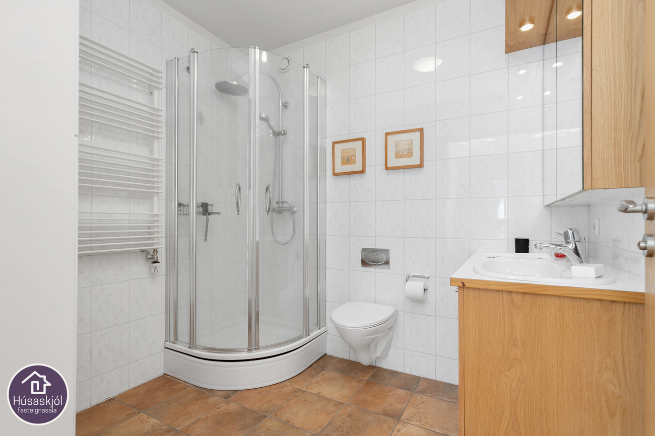 Baðherbergið er er flísalagt, lítil innrétting, sturta, upphengt wc og handklæðaofn.