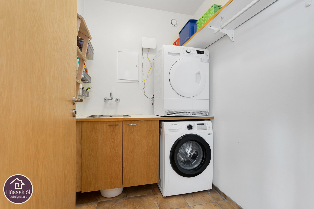 Þvottaherbergið er með lítilli innréttingu, flísar á gólfi.