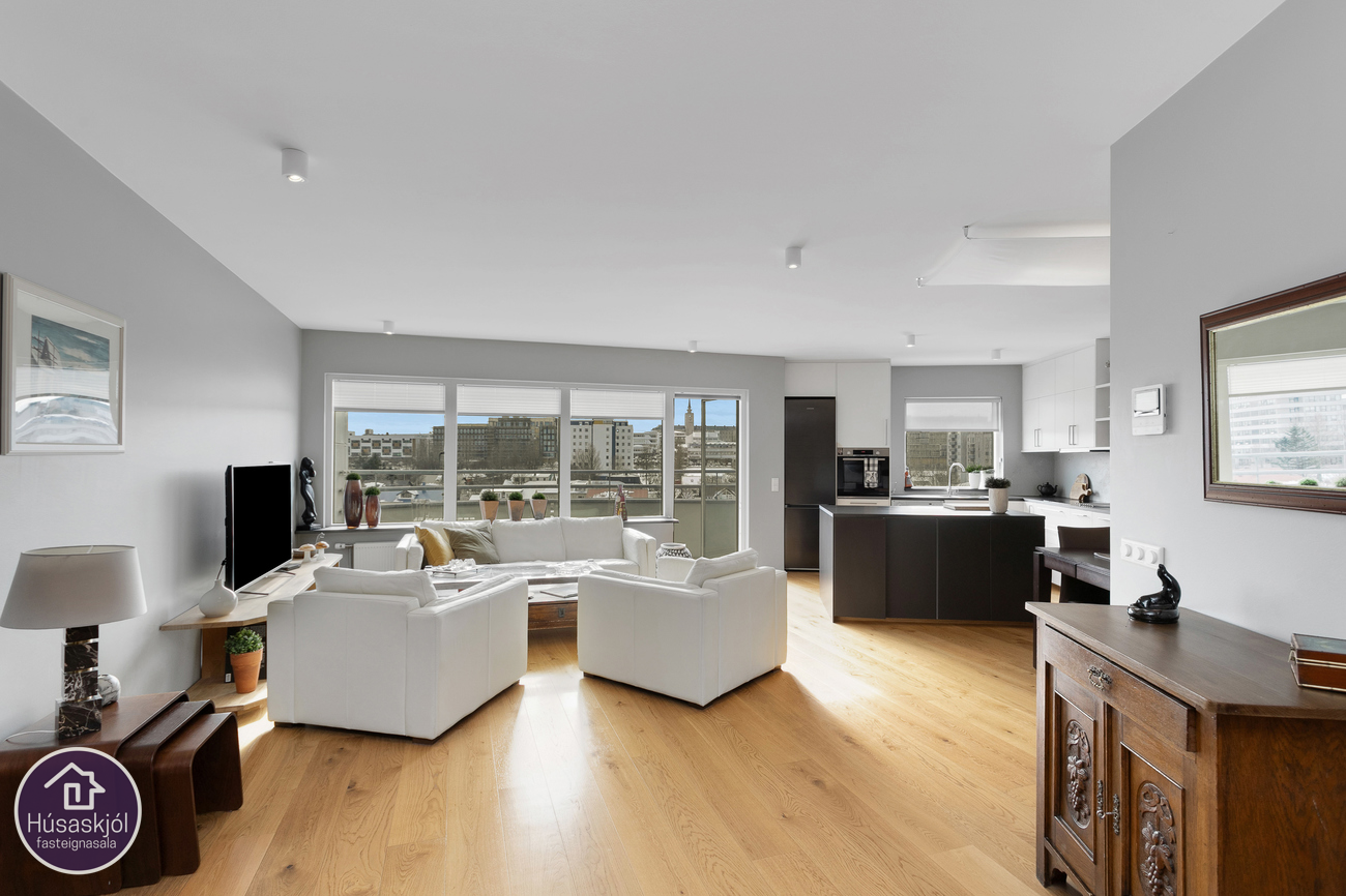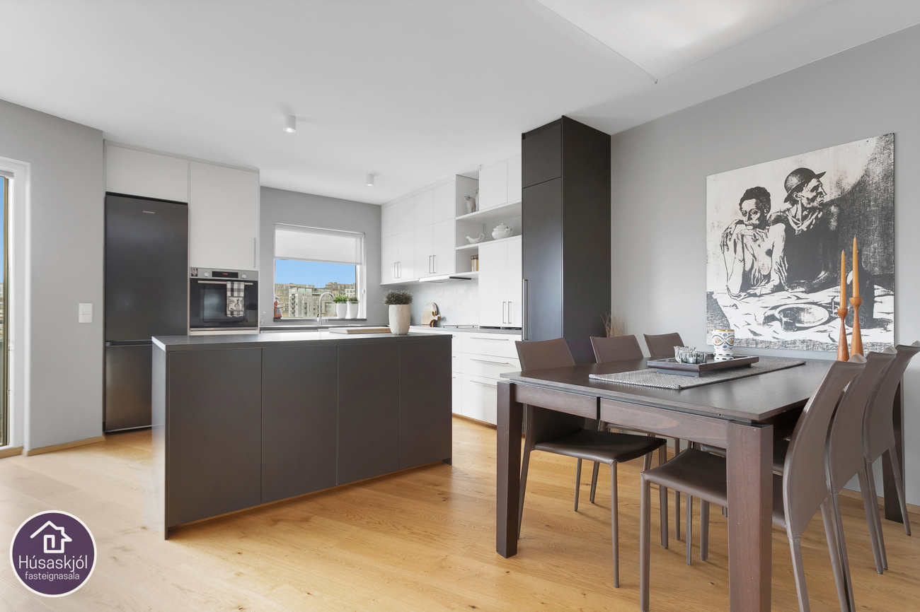Alrýmið er opið, stofa, borðstofa og eldhús. Heilborða parket á gólfi og falleg innrétting, með eyju. Útgengi á svalir er frá stofu.