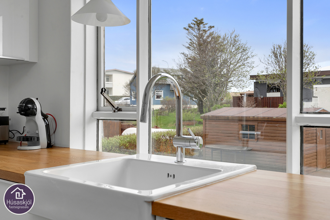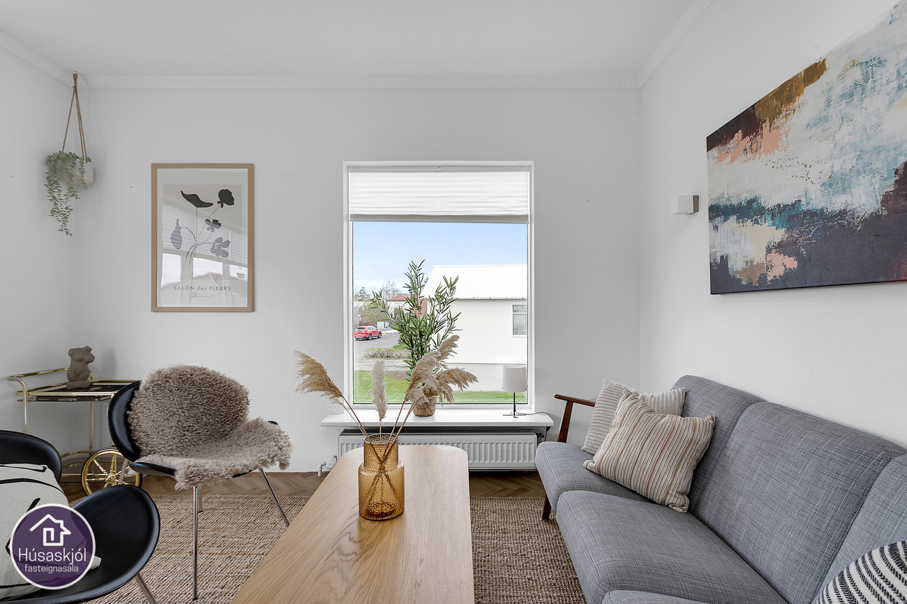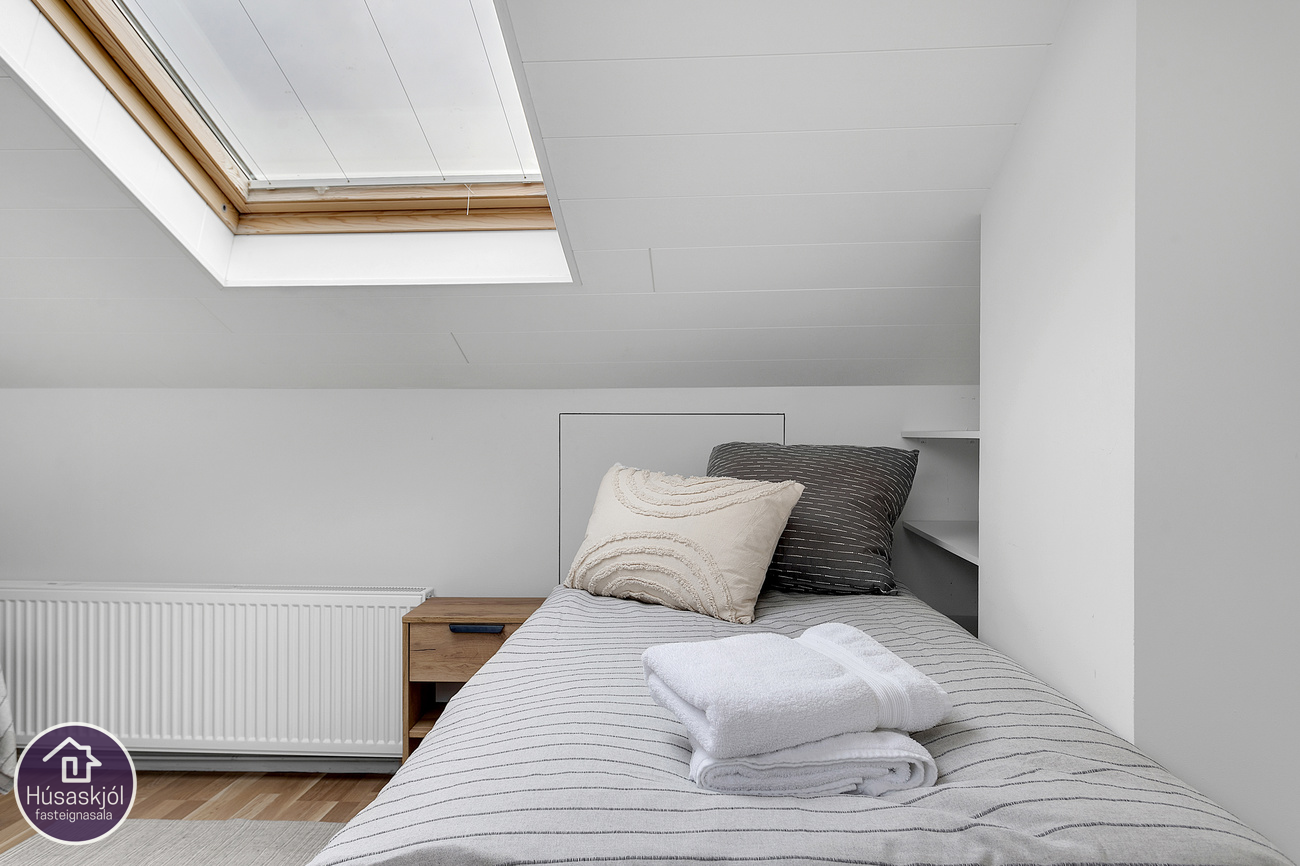 Inngangur er sameiginlegur með neðri hæð. Þaðan er snyrtilegur stigi upp á stigapall með fatahengi. Þegar komið er inn í íbúðina tekur við opið og rúmgott hol með fataskáp sem tengir saman aðrar vistaverur íbúðarinnar.Stofa/borðstofa er rúmgott og bjart rými með stórum gluggum á tvo vegu, til vesturs og norðurs má sjá út á sjó milli húsa í vesturátt. Eldhúsið er endurnýjað með hvítri eldhúsinnréttingu sem er með góðu borð og skápaplássi, rúmgott rými fyrir eldhúsborð og stóla. Endurnýjuð eldhústæki, tveir ofnar í vinnuhæð, keramikhelluborð, háfur, innbyggð uppþvottavél og ísskápur. Einnig eru vaskur og blöndunartæki endurnýjuð. Baðherbergið er með nýlegri ljósri innréttingu sem er með skúffum og innbyggðum vaski og speglaskáp sem er með innbyggðri lýsingu, baðkar með sturtu og gleri, tengi fyrir þvottavél og gólf er flotað og málað. Svefnherbergin eru tvö, hjónaherbergið er rúmgott með góðum upprunalegum fataskápum. Frá stofu er gengið upp á risloftið um nýlegan stiga sem nýtir vel plássið m.a. með innfeldum hirslum meðfram stigauppganginum. Risloftið er bjart og opið alrými með tveimur þakgluggum sem veita góða birtu inn í rýmið. Súðaskápar eru meðfram hliðum rýmisins með góðu geymsluplássi. Risloftið býður uppá á ýmsa möguleika hvort sem er sem sjónvarpsstofa, vinnuherbergi eða herbergi.