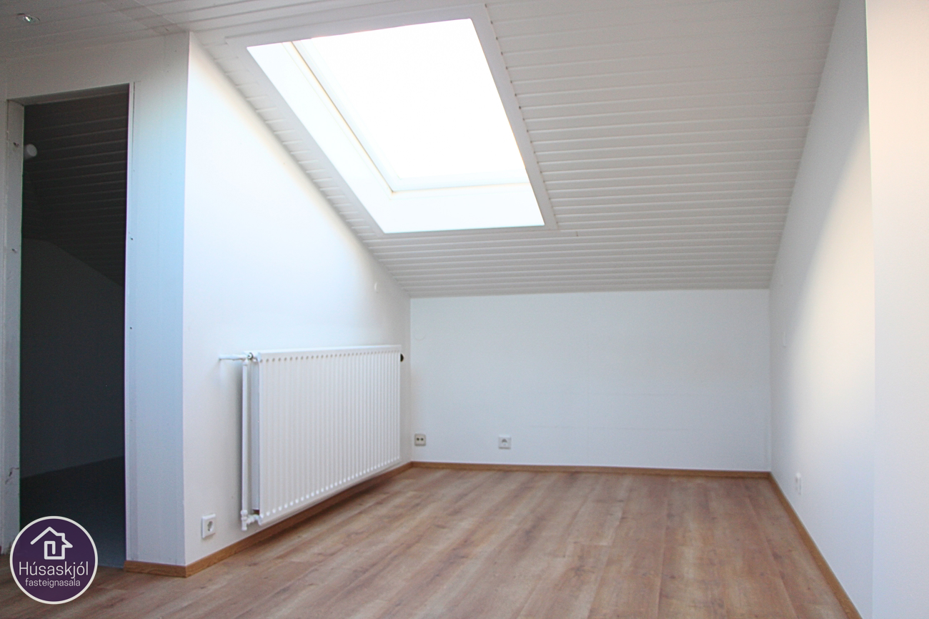 Inngangur er sameiginlegur með neðri hæð. Þaðan er snyrtilegur stigi með steinteppi upp á stigapall. Þegar komið er inn í íbúðina tekur við rúmgott hol sem tengir saman aðrar vistaverur íbúðarinnar og er með stiga upp á risloftið. Rúmgóð stofa-og borðstofa með fallegum stórum gluggum og útsýni út á sjó. Eldhúsið er endurnýjað með hvítri sprautulakkaðri eldhúsinnréttingu sem er með efri-og neðri skápum og gráum flísum á milli, rúmgóð eyja sem hægt er að sitja við. Endurnýjuð eldhústæki, ofn í vinnuhæð og örbylgjuofn, keramik helluborð. Baðherbergið er fallegt og endurnýjað, flísalagt í hólf og gólf. upphengt klósett, sturtuklefi með gleri, viðarinnrétting með skúffum og innbyggðum vask. Herbergi og hjónaherbergi eru rúmgóð með endurnýjuðum fataskápum. Frá holi er gengið upp á risloftið um nýlegan stiga og þar er gert ráð fyrir þvottahúsi ásamt rúmgóðu svefnherbergi með Velux þakgluggum. Einnig eru góðar súðargeymslur.