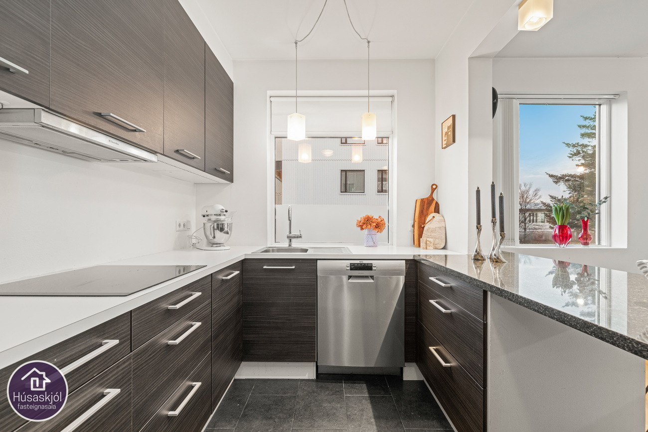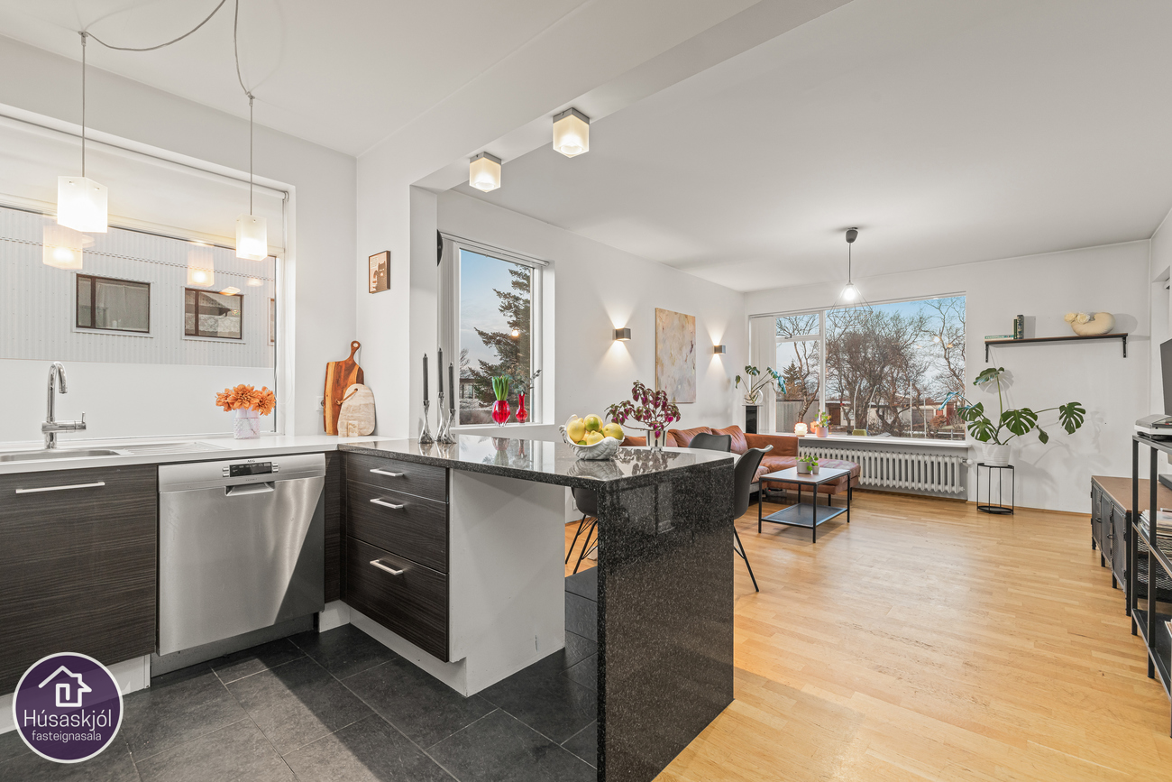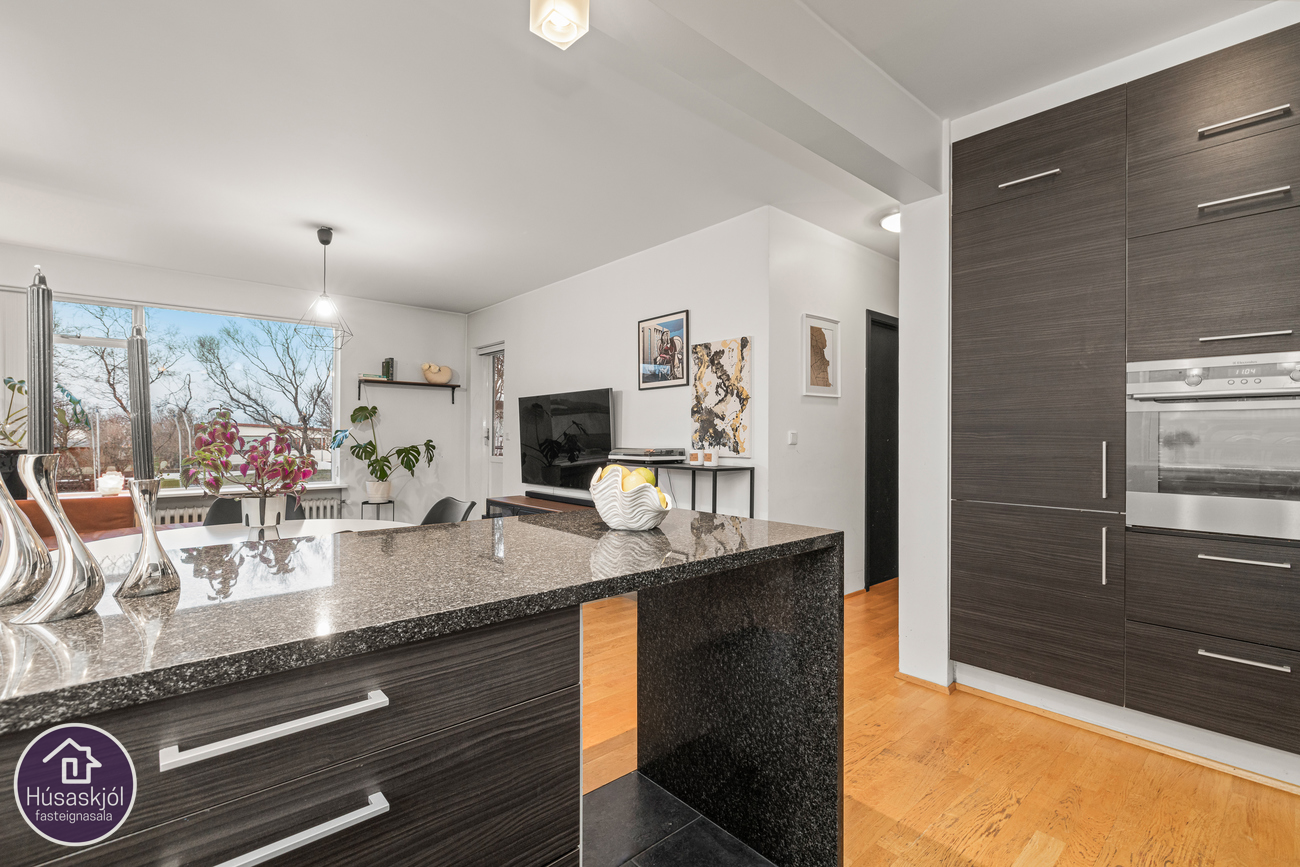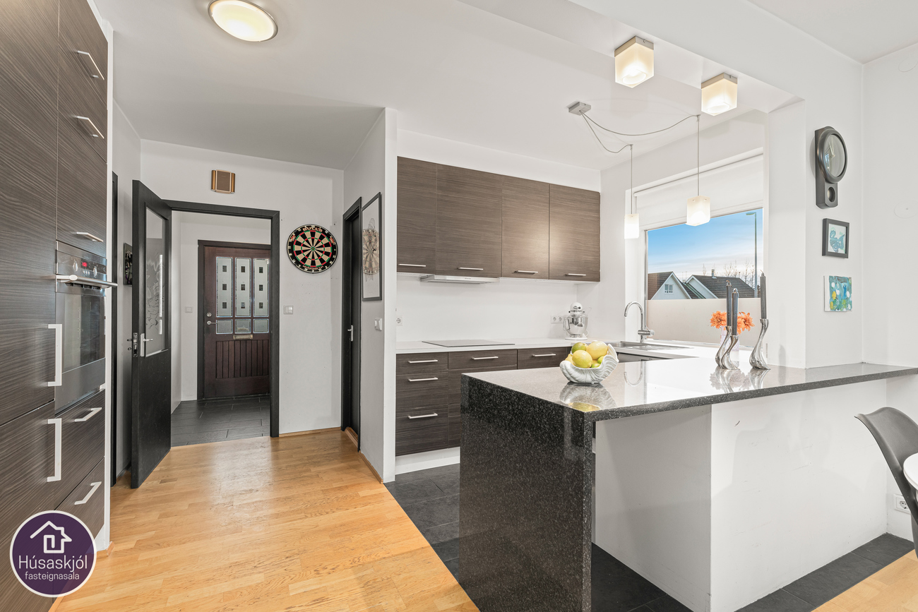 Forstofa er flísalögð með gólfhita og innbyggðum fataskáp með rennihurðum. Eldhús, stofa-og borðstofa eru eitt opið og bjart alrými með útgengi út á 18 fm afgirta timburverönd. Eldhúsinnréttingin er endurnýjuð frá HTH úr dökkum við með efri-og neðri skápum og góðu skápaplássi, eyja með graníti sem hægt er að sitja við. Vönduð eldhústæki, ofn í vinnuhæð, keramikhelluborð, vifta og innbyggður ísskápur/frystir. Gólfhiti er í eldhúsi. Baðherbergið er mjög rúmgott, flísar á gólfi og veggjum að hluta, rúmgóður sturtuklefi með gleri, hvít innrétting með skúffum og vask ofan á borðplötu ásamt dökkum skápum frá HTH. Upphengt klósett, handklæðaofn og gluggi sem er opnanlegur. Gólfhiti er á baði. Svefnherbergin eru tvö, rúmgott barnaherbergi og hjónaherbergið er með hvítum fataskápum og út frá hjónaherberginu er útgengt út á veröndina.
