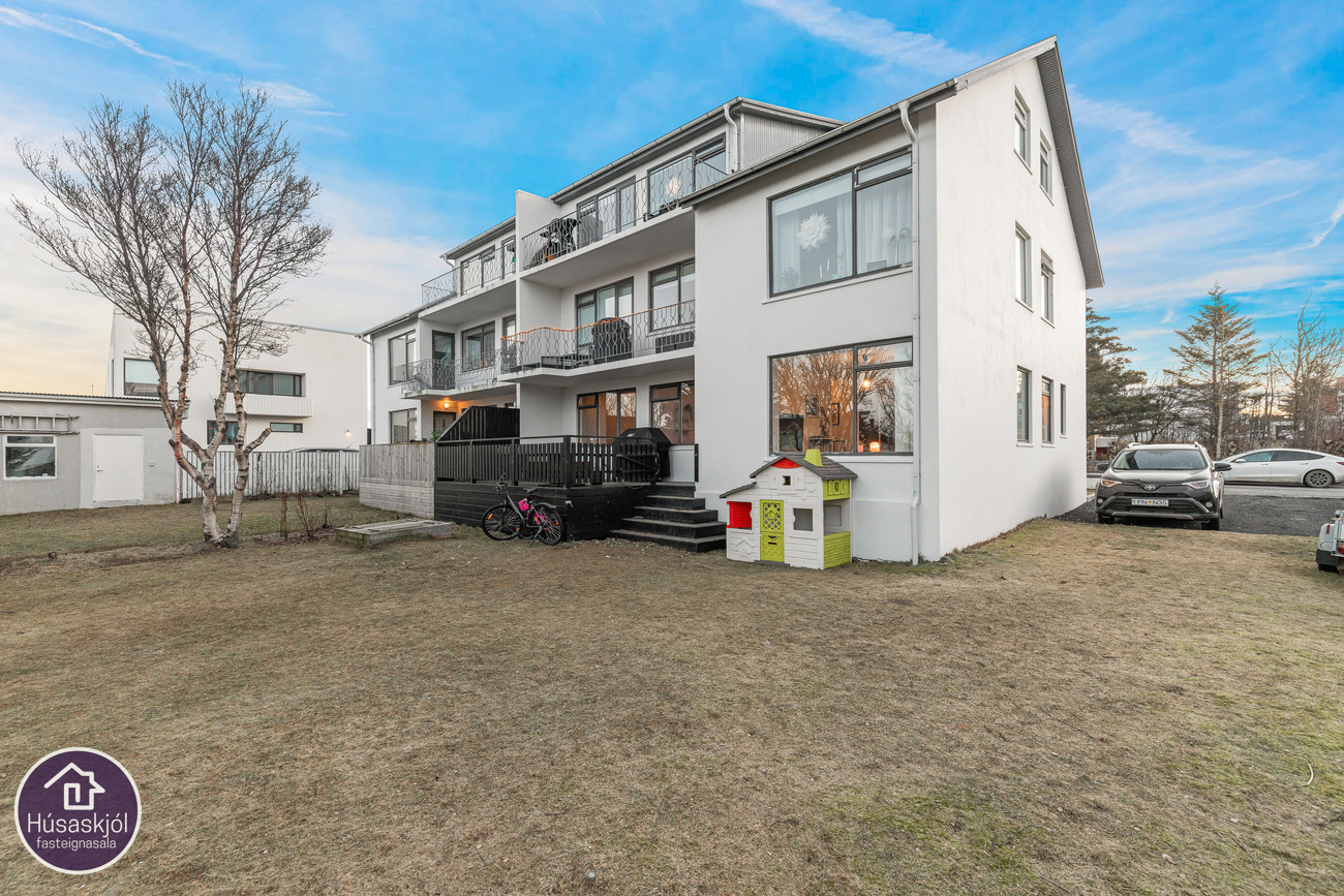Í sameign á fyrstu hæð er sér geymsla og sameiginlegt þvottahús með þremur íbúðum þar sem hver er með sína þvottavél. Garðurinn er skjólsæll og gróinn. Sér bílastæði á lóð og bílskúrsréttur.