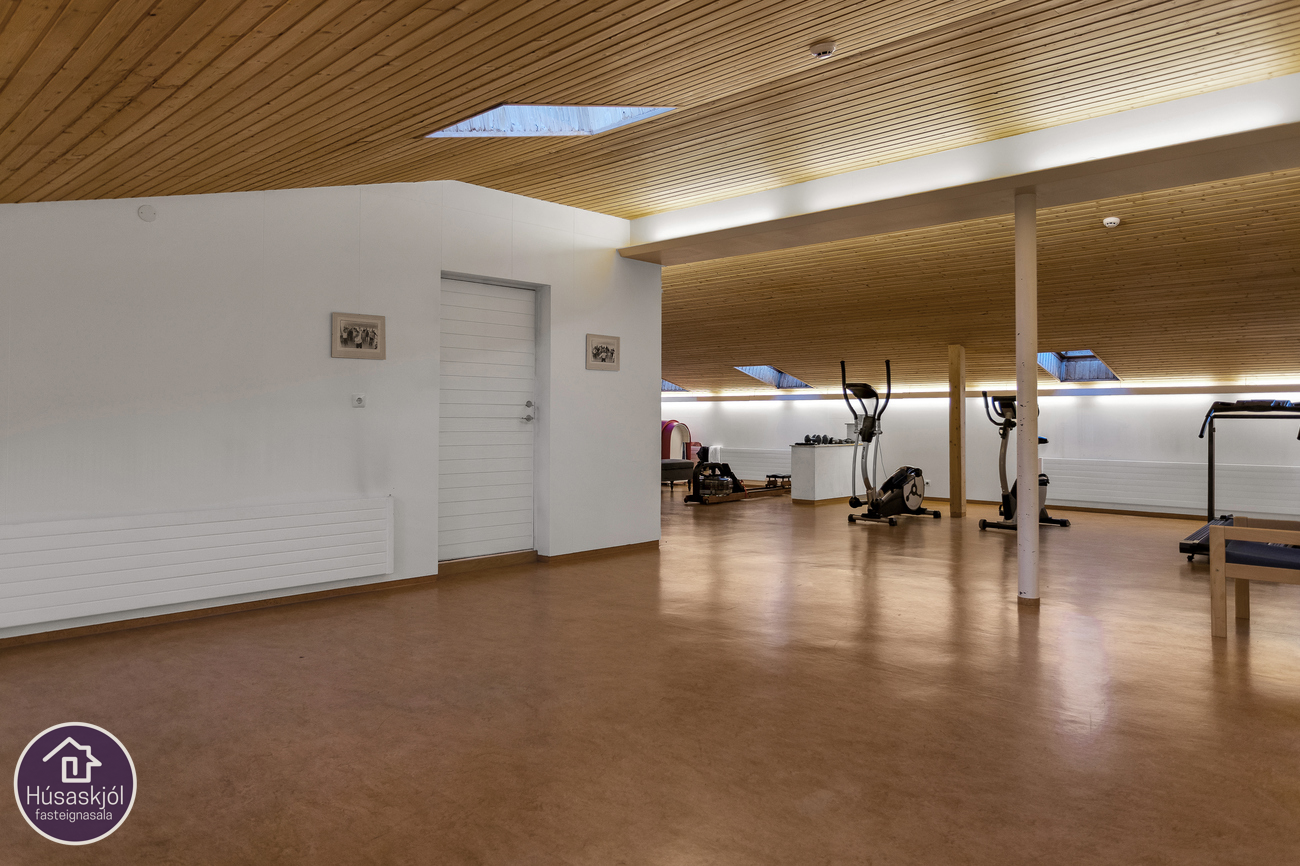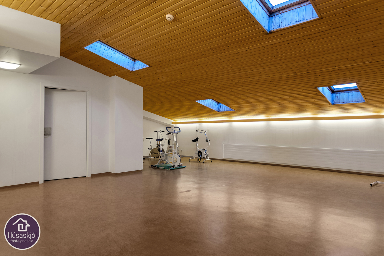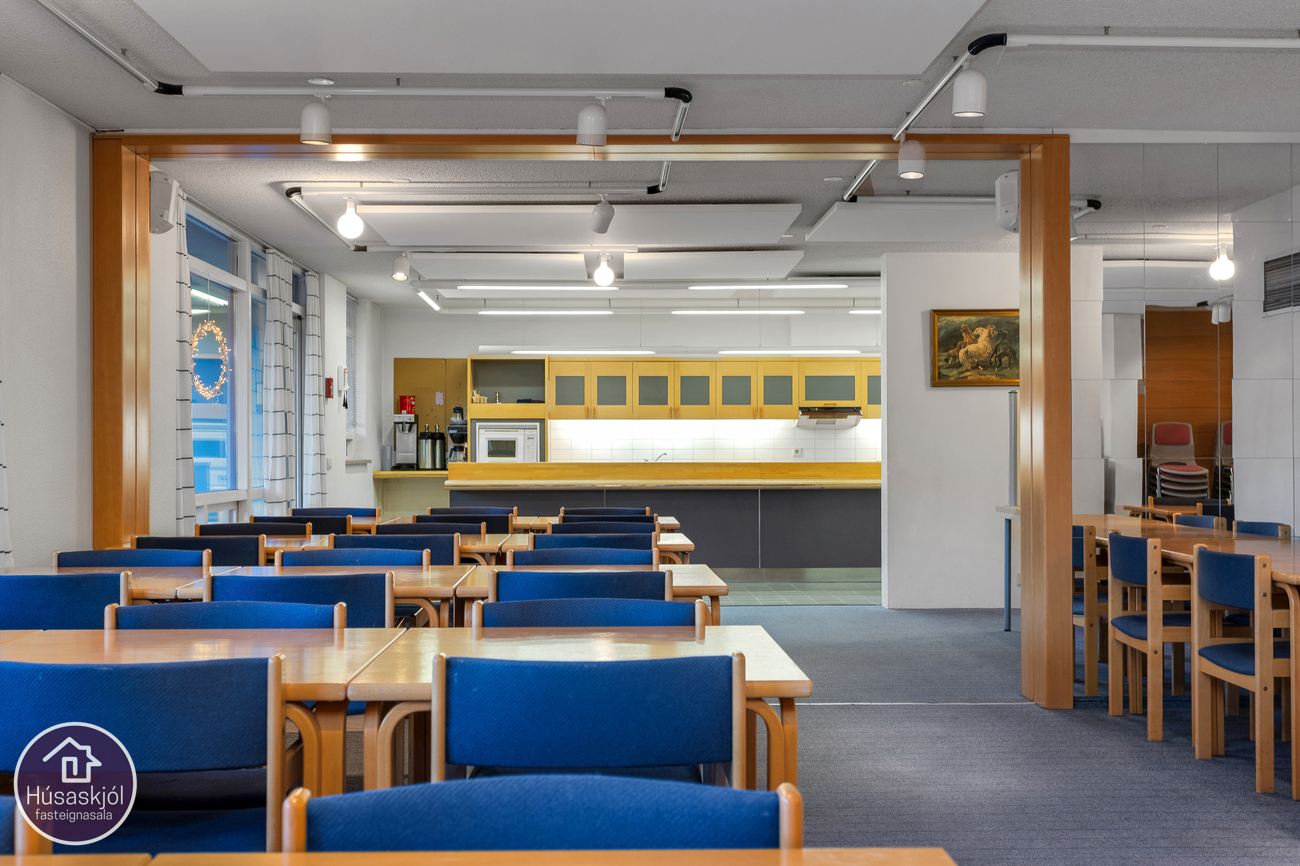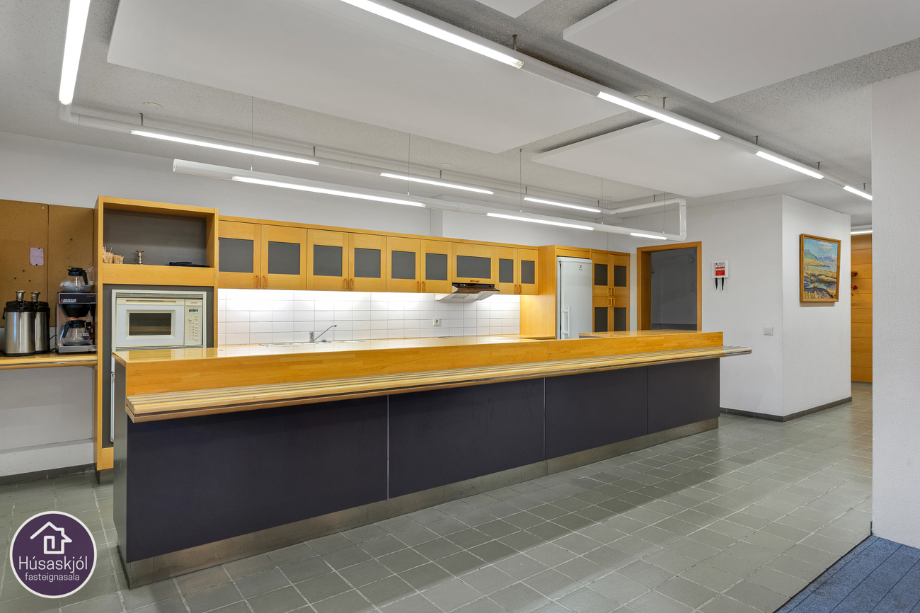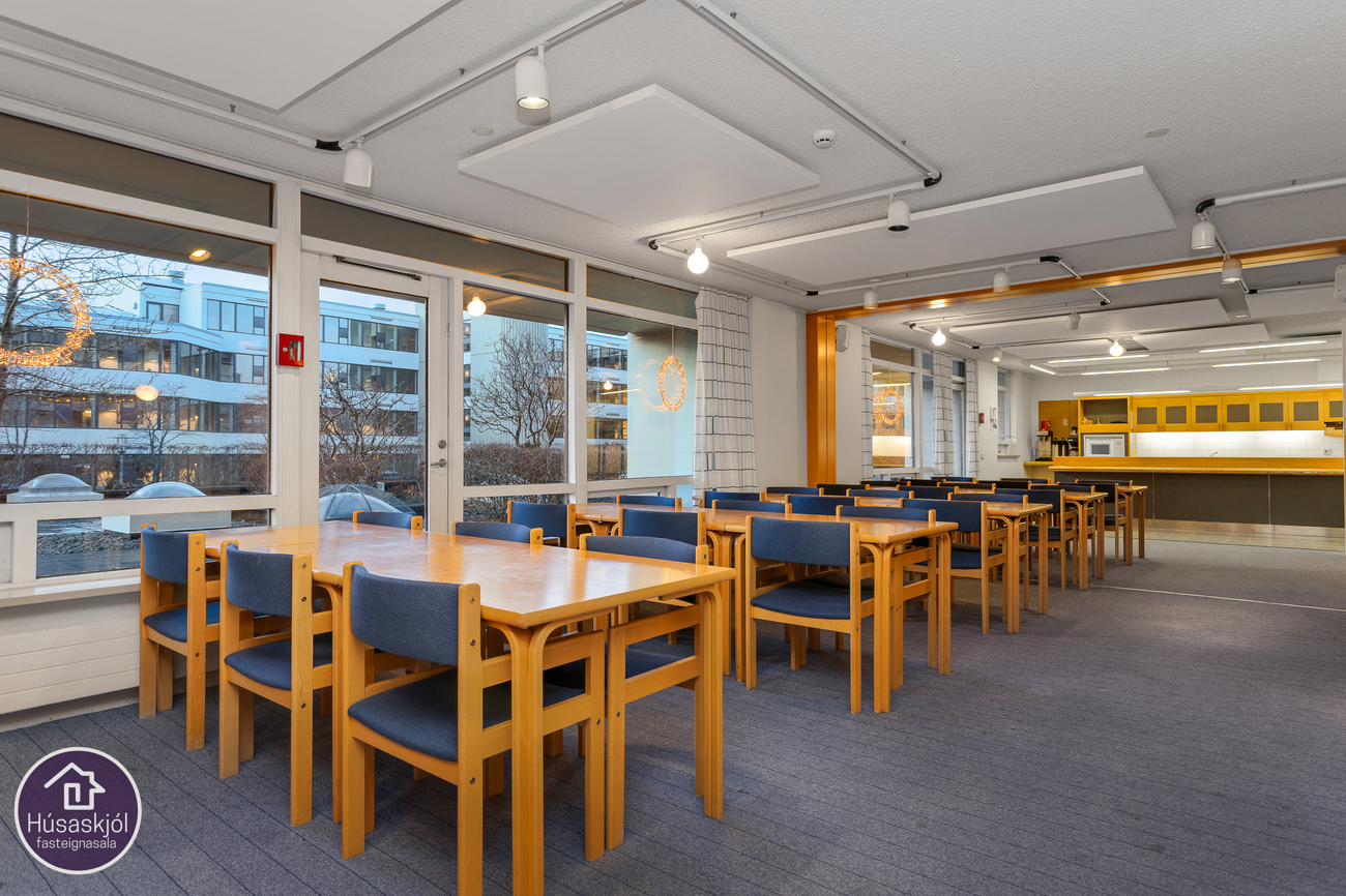 Sameiginlegur veislusalur með eldhúsi og útgengi á lóð til suðurs, flísalögð salerni. Skrifstofur og fundarherbergi á 1. hæð tilheyra sameign.