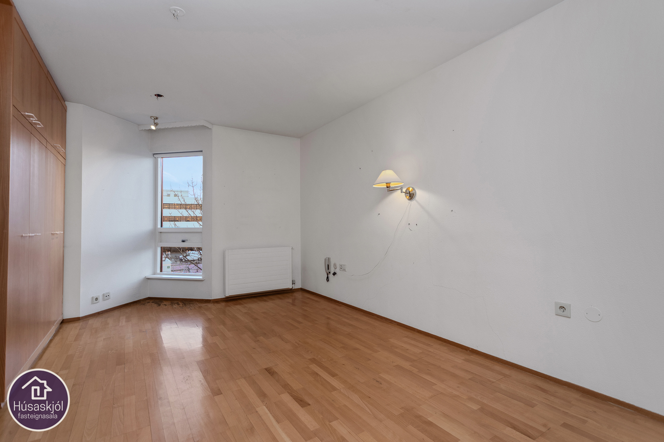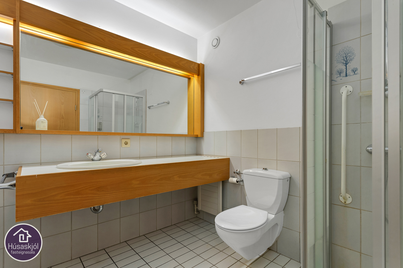 Hjónaherbergi: stórt, parketlagt með góðum fataskápum. Baðherbergi: rúmgott, flísalagt gólf og veggir, baðkar, flísalögð sturta og innrétting.