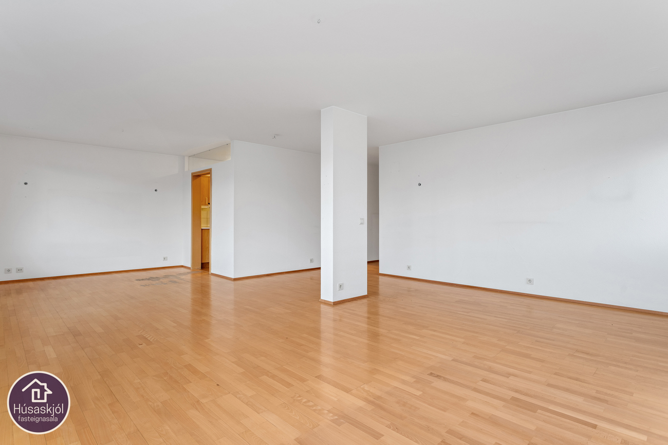 Þvottaherbergi: inn af eldhúsi, korkflísar á gólfi, hillur, vinnuborð og vaskur. Samliggjandi stofur: stórar og bjartar, parketlagðar, gluggar í tvær áttir, gluggakistur úr náttúrusteini. Úr stofu er útgengi á stórar svalir til suðurs.