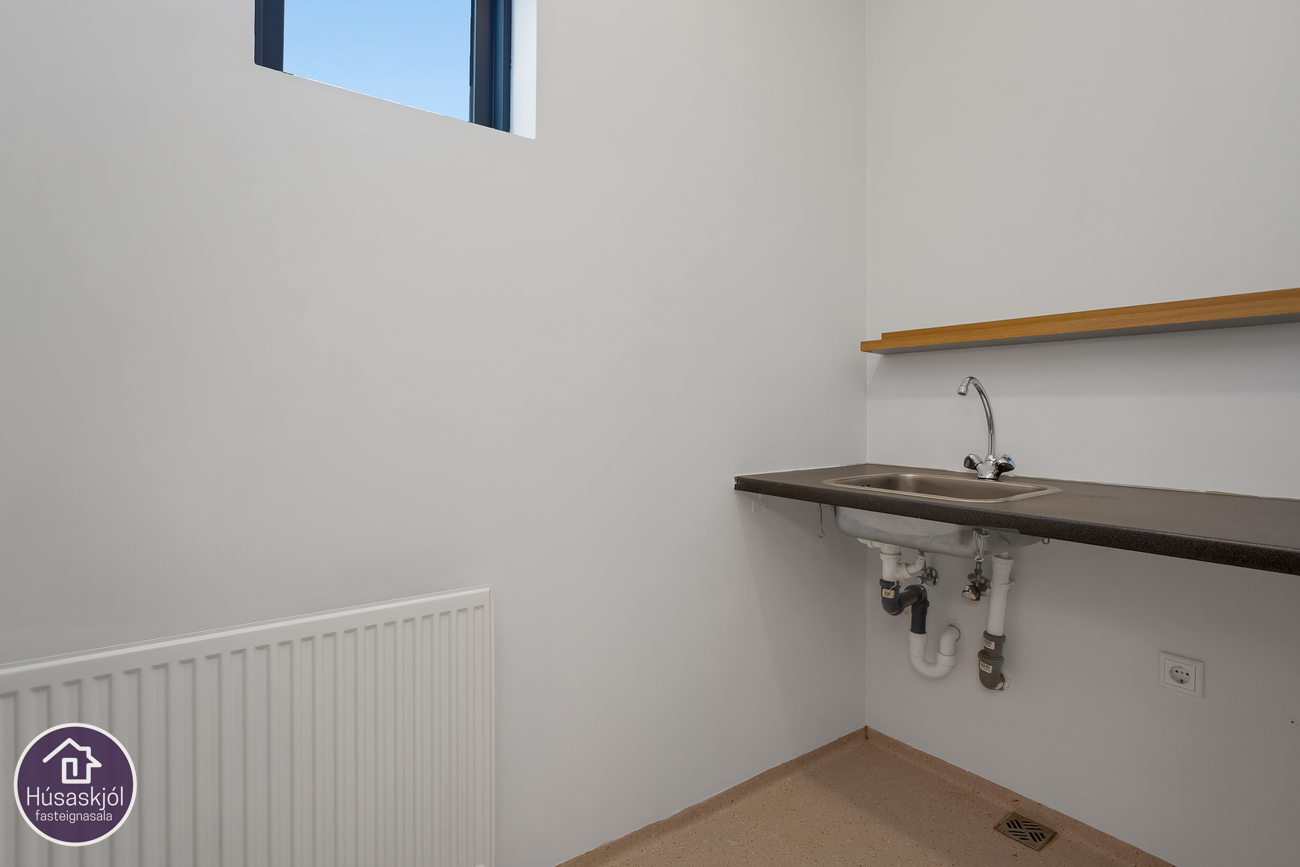 Þvottahúsið er með vaskaborð og dúk á gólfi.