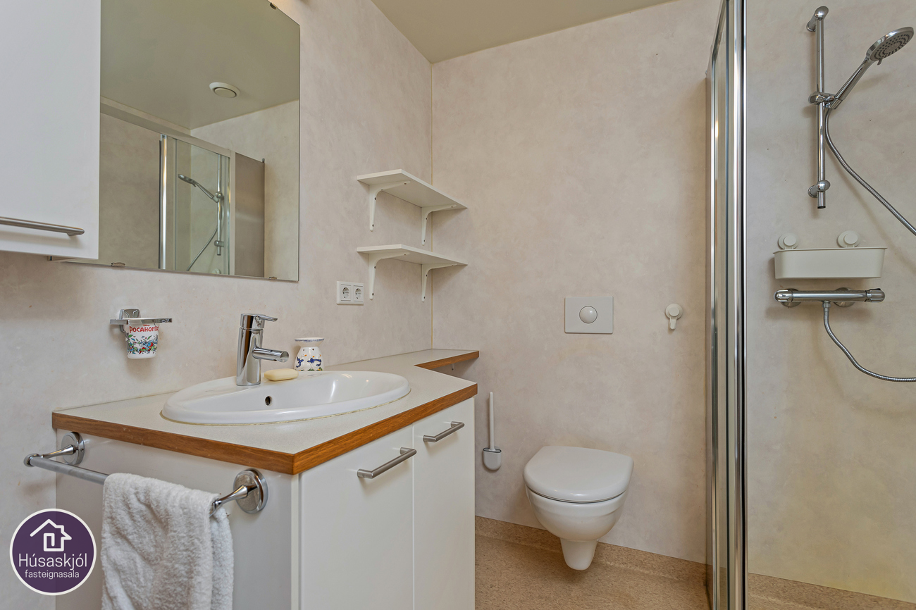 Baðherbergið er rúmgott. Innrétting með handlaug, spegill yfir handlaug og skápur við hlið spegils. Á baðherberginu er vegghengt salerni, sturta og tengi fyrir þvottavél, en einnig er nóg pláss fyrir þurrkara. Það er þó þurrkari í sameign og það rými er beint á móti íbúðinni.