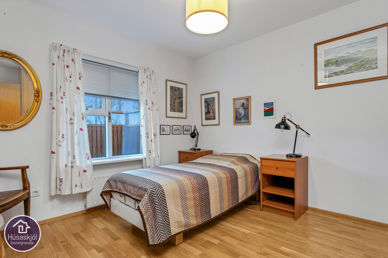 Svefnherbergið er rúmgott með góðum fataskápum og parketi á gólfi.