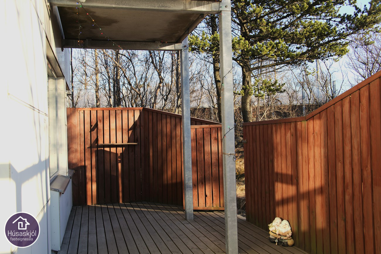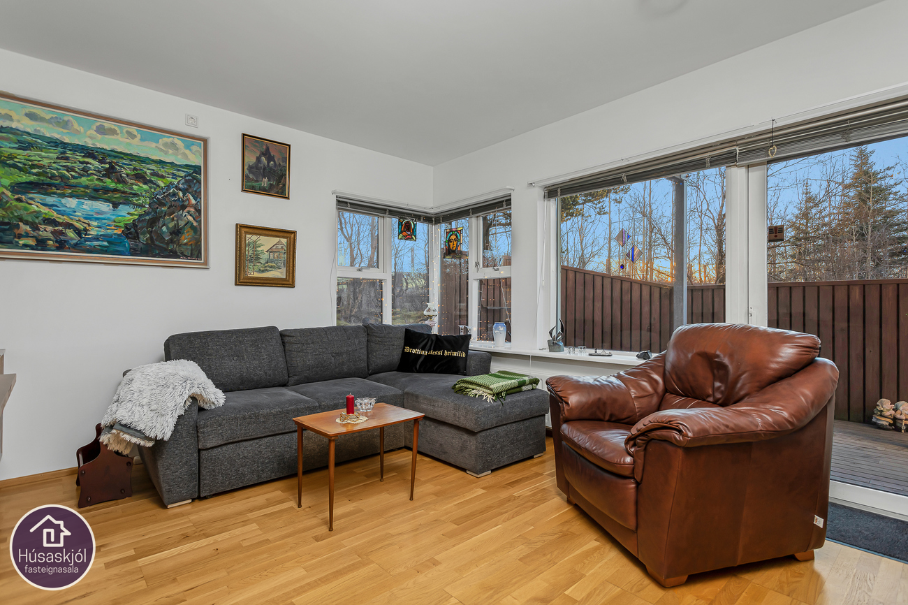 Stofa/borðstofa rúmgóð með góðum gluggum og parketi á gólfi. Gengt er frá stofu út á afgirta viðar- verönd með hliði, snýr í suður (þinglýst einka útisvæði skv. eignaskiptayfirlýsingu).