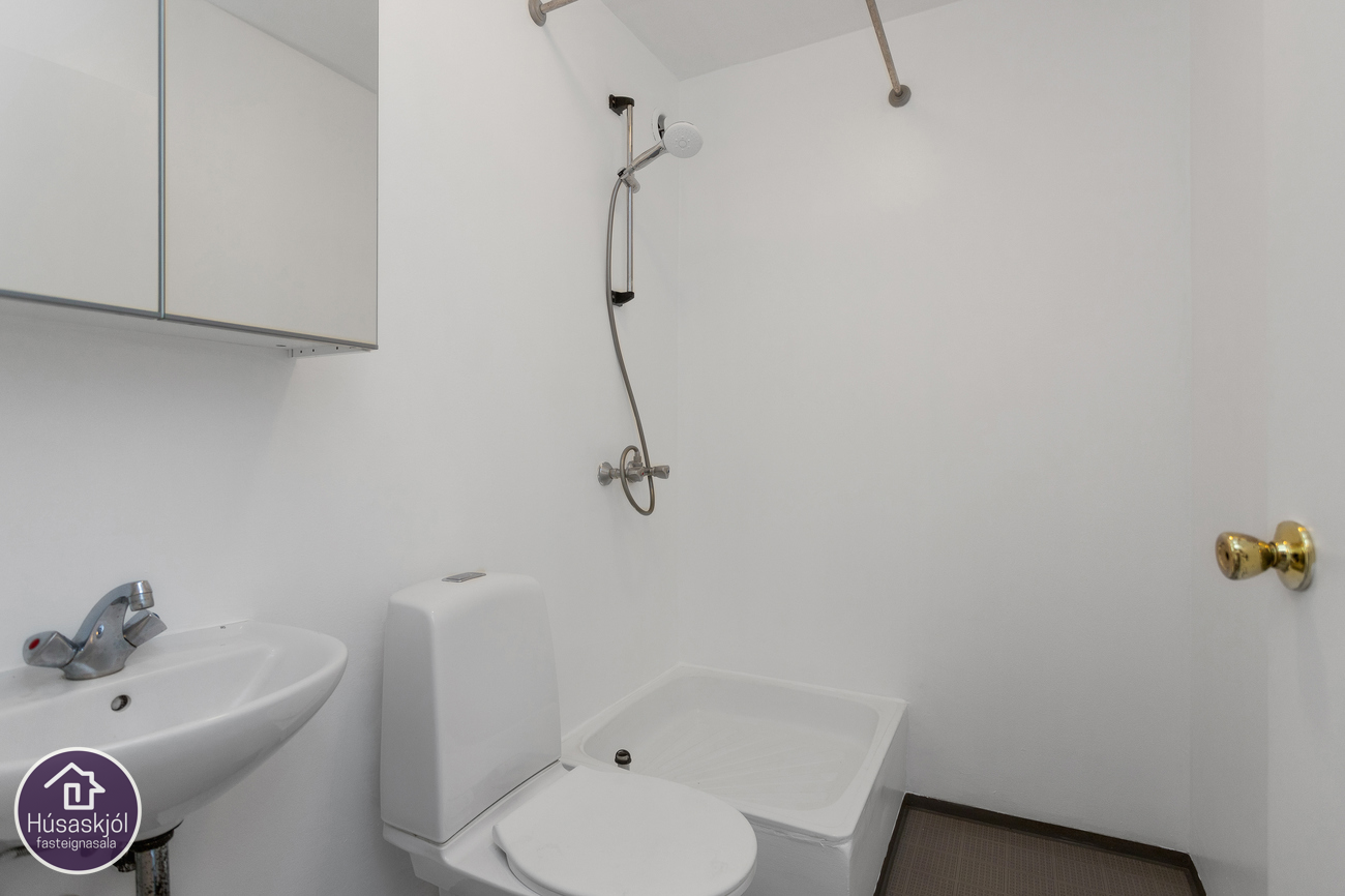 Lýsing eignar: Gengið er inn í forstofu með skápum. Baðherbergi með sturtuklefa og dúk á gólfi. Eldhús er með L-laga innréttingu og efri og neðri skápum. Frá stofu er gengið út á rúmgóðar suðursvalir og í enda stofu er opið svefnrými með opnum skápum.